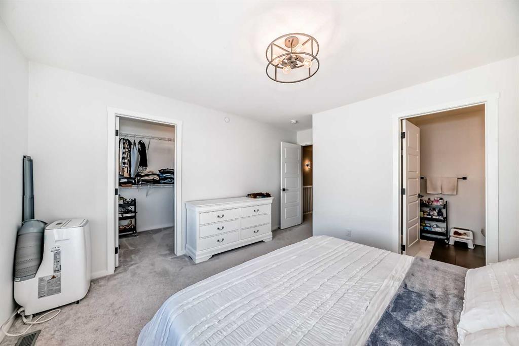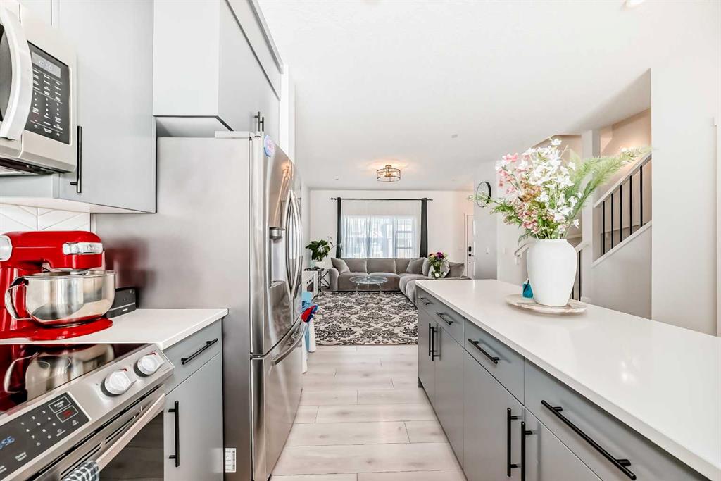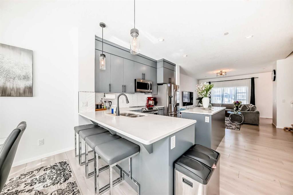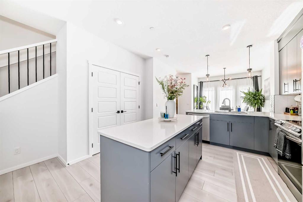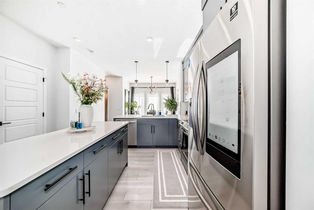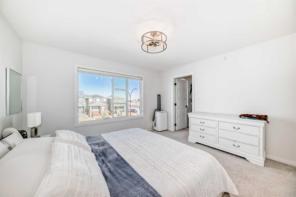 Modern & Bright 3-Bedroom Home in Desirable Livingston Welcome to contemporary living in the heart of the sought-after Livingston community! This stunning 3-bedroom home offers a modern design, stylish finishes, and a fantastic layout, perfect for a family or anyone looking for a move-in ready property with an exciting backyard space. Interior Highlights Step inside to a bright, open-concept main floor flooded with natural light. The inviting living room features a chic, neutral colour palette, beautiful flooring, and an elegant staircase, creating a sophisticated and comfortable space. The gourmet kitchen is a chef's dream, boasting striking blue-grey cabinetry, pristine white quartz countertops, sleek stainless steel appliances (including a modern fridge with a smart display), and a large central island perfect for meal prep and entertaining. Adjacent to the kitchen, the dining room offers a stylish space for family dinners with an eye-catching light fixture and large windows overlooking the yard. A convenient and beautifully appointed powder room is also located on the main floor. Upstairs, you'll find three generously sized bedrooms. The master suite is a true retreat, featuring a spacious layout, a large window with community views, a walk-in closet, and a private 3-piece ensuite bath. The two additional spacious bedrooms and a full main bathroom ensure comfort for everyone. For ultimate convenience, the laundry is also included on this level. Exterior & Community Features The home's exterior boasts attractive curb appeal with its modern architecture and striking siding. The private backyard is an oasis for relaxation and fun, featuring a well-maintained lawn, a back lane for easy access, and charming raised garden beds—perfect for a home gardener! A dedicated fire pit area makes it ideal for cool Calgary evenings and entertaining guests. The Livingston community offers exceptional amenities, parks, and easy access to major routes, making it a highly desirable place to call home. Don't miss the chance to own this exceptional property. Book your private showing today!