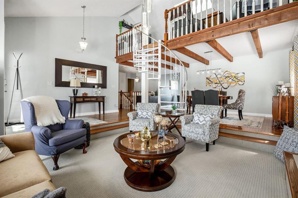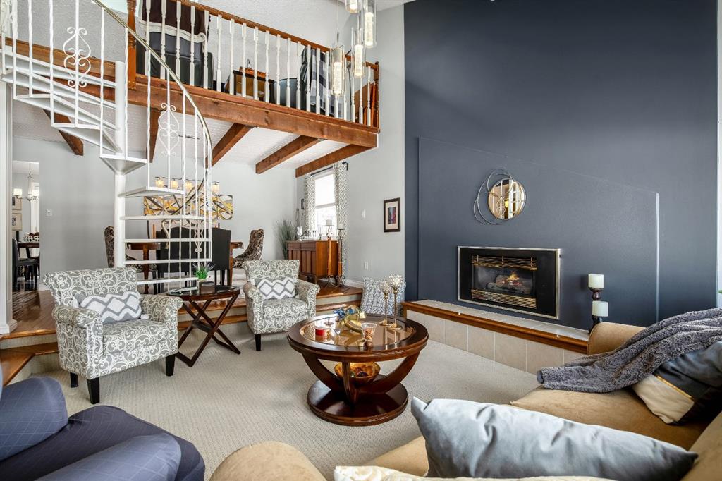 The main level features a sunken living room with a cozy gas fireplace, creating a warm and inviting space to relax or entertain. A formal dining room showcases a striking spiral staircase leading to the loft—perfect as a TV area, home office, or flex space. The bright kitchen offers ample cabinetry, a functional layout, and an eating area with garden doors opening to a large patio—ideal for indoor-outdoor living.