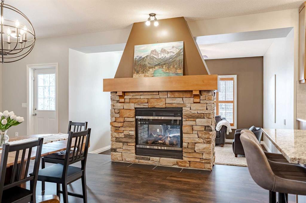 Natural light fills the main level thanks to 9’ ceilings, a sunken living room, and well-placed windows that keep the space bright and open. The layout works beautifully for daily life and entertaining with an island kitchen featuring granite counters, a spacious dining area, and a main-floor den or flex room. A grand double-sided fireplace connects the sunken living room and formal dining area, adding warmth and character to the heart of the home.