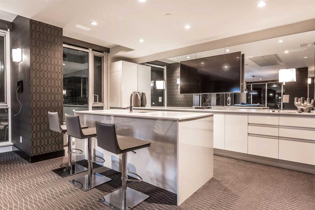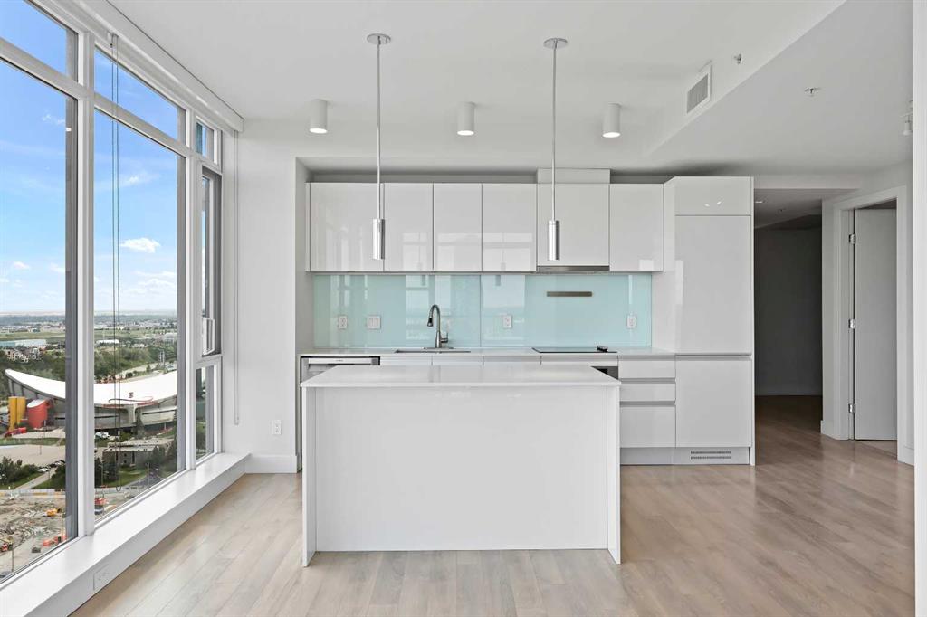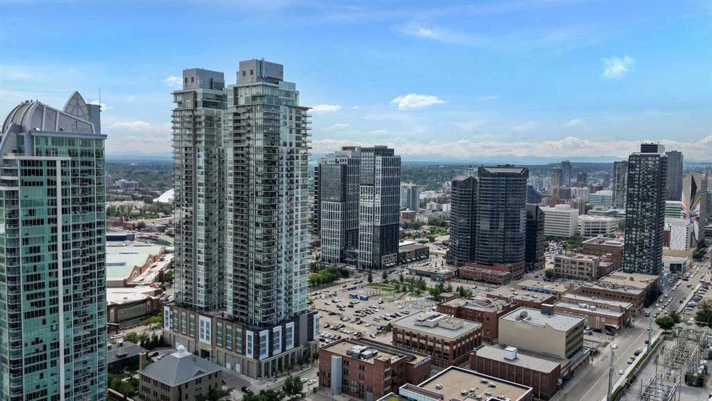 Experience refined urban luxury in this breathtaking 27th-floor corner residence at The Guardian, Calgary’s tallest residential tower. Perfectly situated in the dynamic and historic Victoria Park, this premier address places you just steps from the iconic Scotiabank Saddledome, Stampede Park, Studio Bell, and the architectural masterpiece of the Calgary Central Library — offering the ultimate downtown lifestyle at your doorstep. Inside, walls of floor-to-ceiling windows frame jaw-dropping panoramic views of downtown Calgary, the Bow River, East Village, and Stampede Park, filling the home with an abundance of natural light from sunrise to sunset. The open-concept living and dining space is designed to impress — ideal for entertaining or unwinding against a stunning city backdrop. At the heart of the home, the custom Italian Armony Cucine kitchen is a true showpiece, featuring sleek quartz countertops, a dramatic full-height glass backsplash, and premium stainless-steel appliances — a seamless blend of sophistication and function. Retreat to the dreamy primary suite, complete with custom built-in closets, captivating skyline and river views, and a spa-inspired 4-piece ensuite designed for total relaxation. A spacious second bedroom with custom built-ins, a full guest bath, and convenient in-suite laundry round out this intelligently designed layout. Additional highlights include upscale finishes throughout, an oversized private balcony perfect for summer evenings, titled underground parking, and a dedicated storage locker. Residents of The Guardian enjoy exceptional amenities including a state-of-the-art fitness centre, yoga studio, stylish social lounge with outdoor terrace, workshop, and the comfort of full-time concierge and security services. Whether you’re a professional seeking sophistication, an investor looking for a premier asset, or simply someone who values elevated design and unbeatable convenience, this is downtown Calgary living at its absolute finest.
