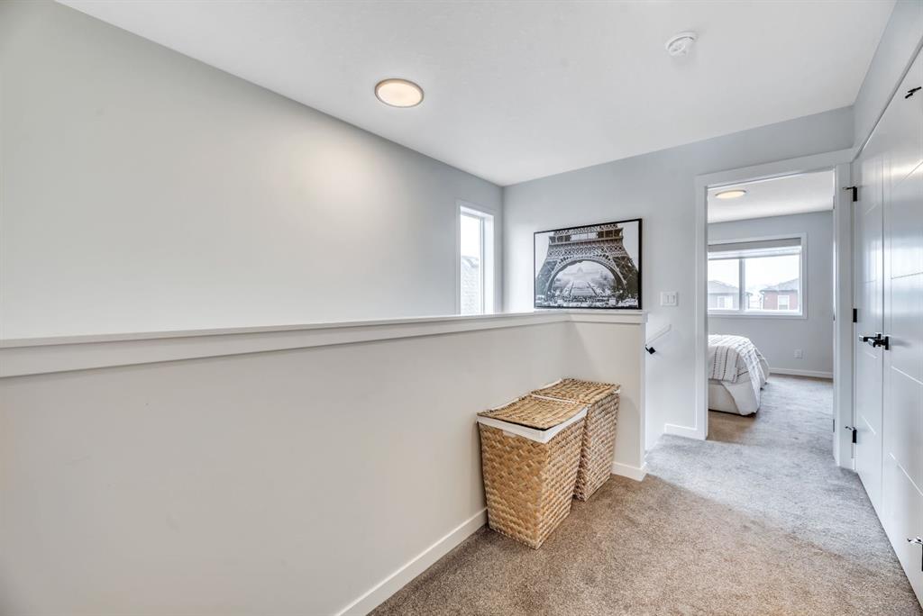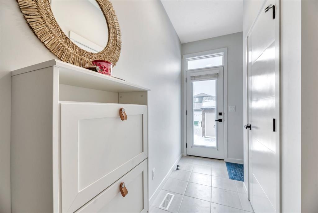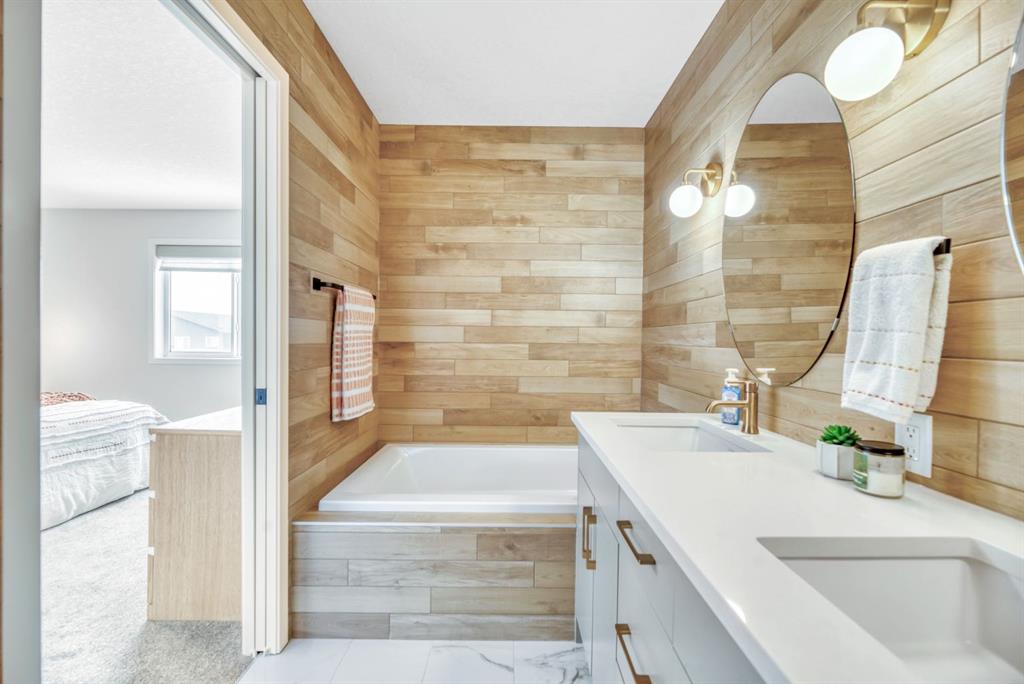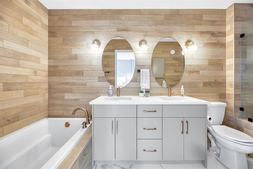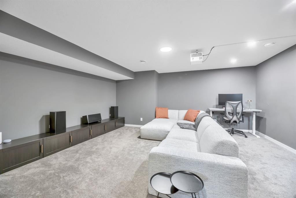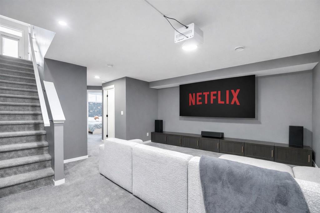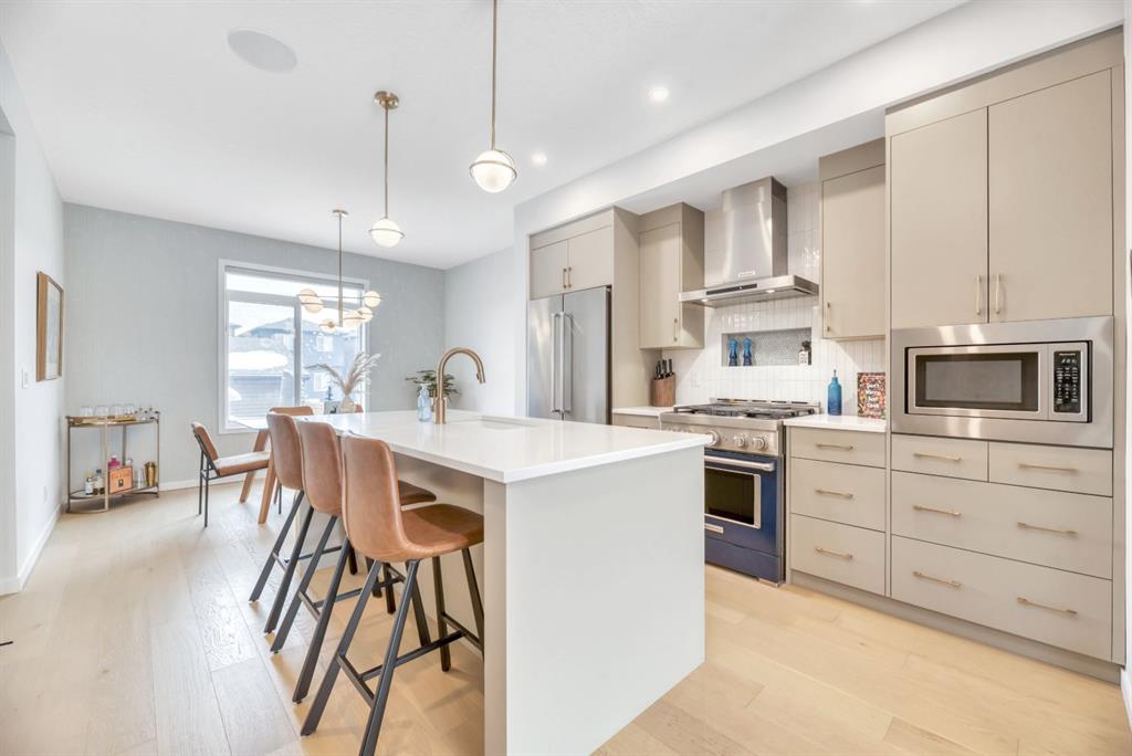 Luxury Living in Wolf Willow | Steps from Fish Creek Park Welcome to an exceptional, fully upgraded residence in the community of Wolf Willow, ideally located steps from Fish Creek Park, scenic pathways, and the Woof Willow dog park. Offering over 2,100 sq. ft. of impeccably finished living space, this home delivers sophisticated design, premium finishes, and a lifestyle rarely found at this price point. The south-facing, professionally landscaped backyard provides a private outdoor retreat designed for both entertaining and everyday enjoyment. Features include a modern stone patio (15ft. x 18ft.), a stone walkway (4ft. x 13ft.) leading to the double detached garage, washed rock dog run, and curated mulch garden beds. The double detached garage offers additional storage capacity without compromising functionality. Inside, a tiled front entryway sets the tone for the refined interiors, complemented by abundant natural light from numerous oversized, upgraded windows, all dressed with Hunter Douglas light-enhancing sheer shades. The main floor features 9-foot ceilings, with the living room elevated to 10 feet, anchored by a striking floor-to-ceiling tiled fireplace finished with a custom natural oak mantle. Designed with entertaining in mind, the main level includes built-in ceiling speakers throughout, a statement custom dry bar with integrated beverage fridge, oak floating shelves, and an oak wine rack. The chef’s kitchen is both elegant and functional, showcasing KitchenAid appliances, including a smart commercial-style gas range in ink-blue, paneled dishwasher, an impressive 7-foot island, and upgraded white quartz countertops throughout the entire home. White oak engineered hardwood flooring adds warmth and timeless appeal. A designer powder room with moody wallpaper, smart-home Lutron lighting controls throughout, and a generous mudroom with tile flooring, built-in shelving, and shoe storage complete the main level. Upstairs, the primary suite offers a true spa-inspired ensuite, fully tiled in wood-look porcelain with timeless sconce lighting, an oversized soaker tub, and a tiled shower featuring a bench and slide-bar hand shower. Secondary bedrooms are generously proportioned and include custom closet systems. A spacious main bathroom provides abundant storage, while the upgraded upper-level laundry includes premium washer and dryer with additional built-in shelving. The fully developed, purpose-built basement is a private entertainment retreat, professionally wired for 11 in-wall speakers, creating an immersive home theatre experience. This level also includes a fourth bedroom with 9-foot ceilings and natural light, along with a full third bathroom, ideal for guests or multigenerational living. Refined, turnkey, and meticulously upgraded, this Wolf Willow residence offers luxury living with immediate access to Calgary’s most iconic green spaces — a rare opportunity to own a home where design, lifestyle, and location converge.