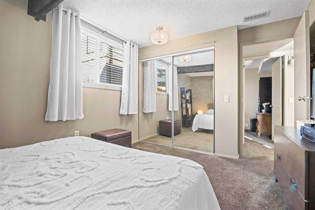 Tucked away in a quiet cul-de-sac in the established community of Braeside, this mid-century modern inspired bi-level duplex condo offers the perfect blend of style, comfort, and location. The main level is 534 sq ft and showcases beautiful natural wood vaulted ceilings, engineered hardwood floors, and an open, airy layout filled with natural light. The newly renovated kitchen features cutting board–style countertops, stainless steel appliances, and flows seamlessly into the spacious dining and living areas — highlighted by large windows and a striking metal egg-shaped wood-burning fireplace. Step out from the dining area to your private deck overlooking a peaceful park with mature trees and a playground — an ideal spot to relax or entertain. A tastefully updated 4-piece bathroom completes this level. The lower level is 460 sq ft and offers two bright bedrooms with large windows, a utility room with laundry, and ample storage space. Additional features include one assigned parking stall and plenty of visitor parking. Perfectly located close to Fish Creek Park, Glenmore Reservoir, Weaselhead Flats, schools, shopping, restaurants, medical facilities, and major roadways — offering easy access around the city or a quick getaway to the mountains. Don’t miss the opportunity to own this stylish, move-in ready home in the mature community of Braeside.
