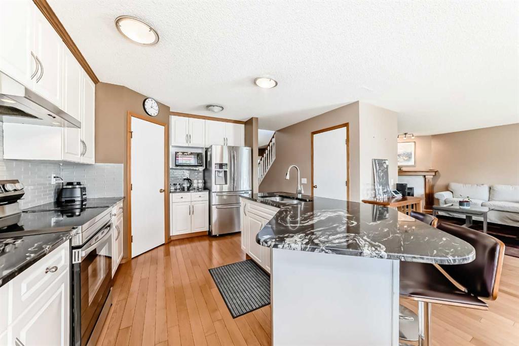 OPEN HOUSE ON Feb.28 and Mar.1 from 2pm-4pm. Well maintained two Story Home in a quiet Cul De Sac, amazing location. The main floor begins with a bright high ceiling foyer and a front office. Leading to the rear of the house, the chef's kitchen features with stone countertops, white cabinets, tiled backsplash, a custom-built pantry and large island with eating bar. The adjacent dining area has a door leading onto the balcony overlooking the deep backyard and green belt. The family room features a large window allowing loads of natural light and is accented with a cozy fireplace. The main floor is completed by a two-piece powder bathroom and laundry room. Gleaming hardwood flooring throughout the main floor and upper staircase. The upper level offers two spacious bedrooms and the huge primary bedroom with walk-in closet and a 5 piece en suite. Walkout basement features a 4th bedroom, 3 piece bathroom and a large recreation room with wet bar. walkout basement backing onto greenspace. The huge rear private yard is completed by a stone patio and backs onto a greenspace. Recent upgrades including replacement of shingles, a newer furnace and hot water tank, replacement of the deck covering, fencing, renovated ensuite bathroom, custom-built kitchen pantry and flooring.