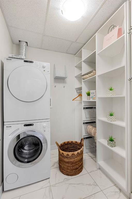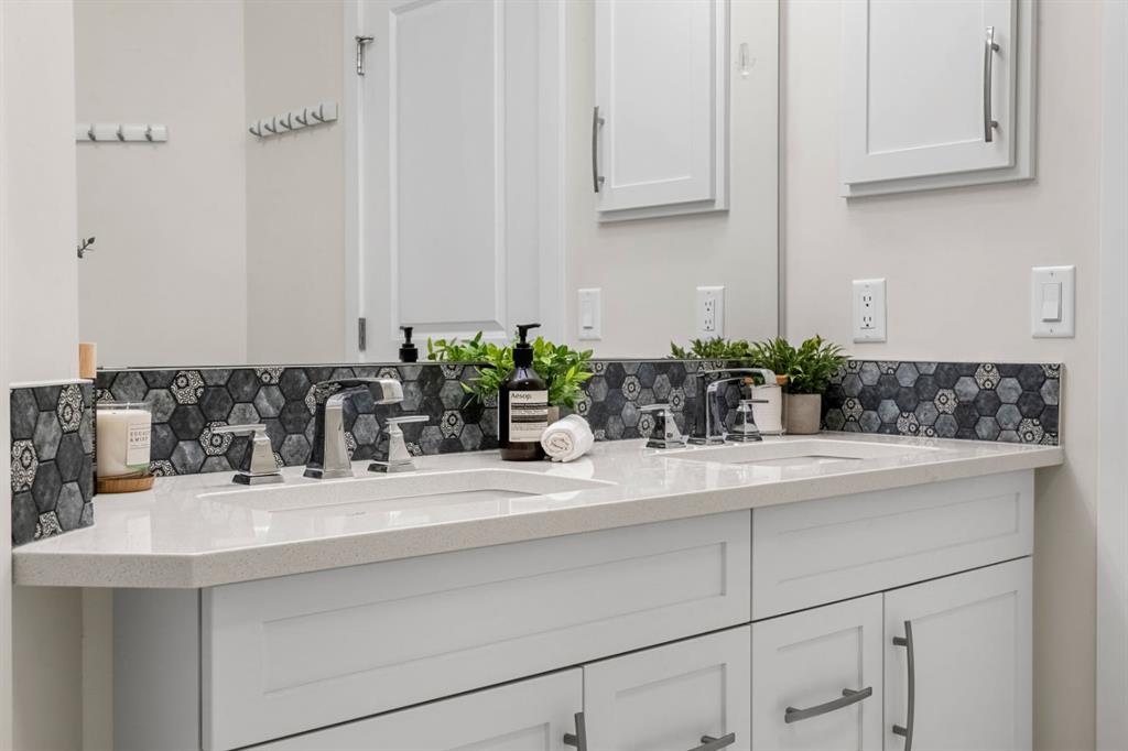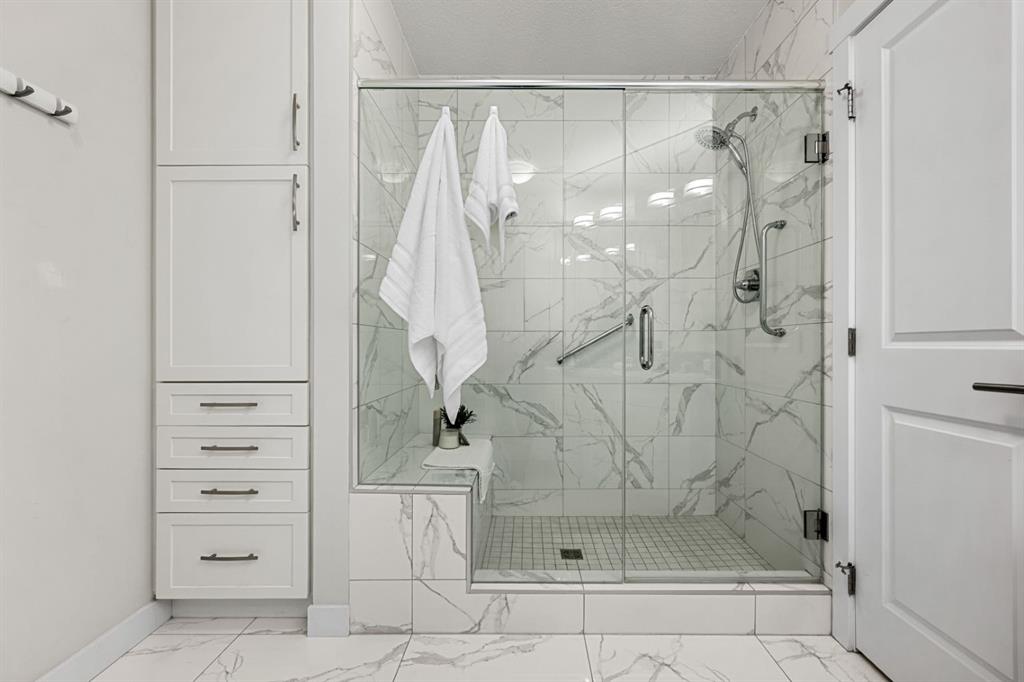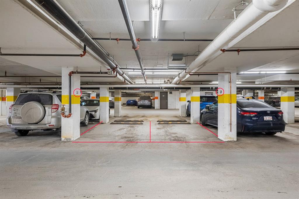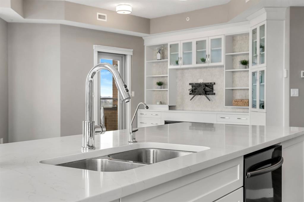 Welcome to penthouse living at the Groves of Varsity. Situated on the top floor, this corner suite captures unobstructed downtown views, beautiful natural light, and a layout that truly lives well day to day. With 10-foot ceilings and expansive windows, the space feels open and bright throughout. The private balcony, included in only select corner units, offers a gas BBQ hookup and two separate access points: one from the main living area and another from the secondary bedroom. It’s the perfect spot for morning coffee, fresh air, or evening city views. This thoughtfully designed 2-bedroom + den home offers exceptional privacy, with both bedrooms featuring walk-through closets and their own ensuite bathrooms. The primary suite includes double sinks and a glass shower, while the secondary ensuite offers a tub/shower combination, making it ideal for guests. A separate 2-piece powder room is a rare and practical addition for condo living. The kitchen is finished with quartz countertops, induction cooking, sleek cabinetry, and quality appliances. Luxury vinyl plank flooring runs throughout, complemented by custom built-ins and well-planned storage solutions. The secondary bedroom is equipped with a built-in Murphy bed and integrated desk, allowing the space to transition seamlessly between guest room and home office. Hunter Douglas window coverings and dual-zone central A/C ensure comfort year-round, and the in-suite Miele washer and dryer add everyday convenience. This unit includes two titled underground parking stalls that are side-by-side (not tandem), along with a rare double-sized assigned storage locker. Dedicated bike storage is also available in the parkade. Built with steel and concrete construction, the building offers a solid and quiet living environment. Residents enjoy rooftop amenities including a fully equipped fitness centre, steam rooms, an owner’s lounge that hosts yoga classes, and a large terrace with BBQ areas. An attached professional building provides exceptional convenience with a pharmacy, medical and dental clinics, and a coffee shop just steps away. Groceries, restaurants, shopping, banking, and the LRT are all within walking distance. Top-floor, corner location, skyline views, side-by-side parking — a rare opportunity in one of NW Calgary’s most sought-after buildings.