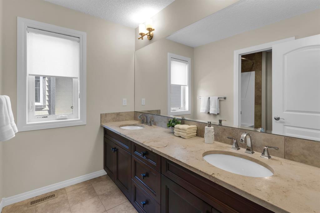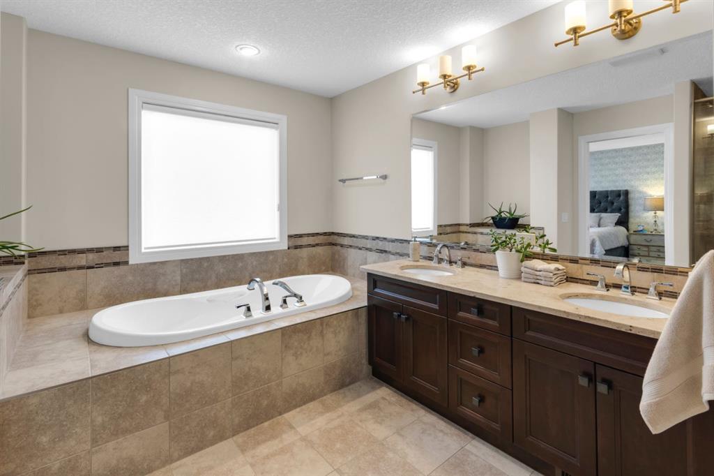The upper level is a true sanctuary. The primary retreat invites relaxation with a spa-inspired ensuite, complete with dual vanities, a deep soaker tub, an oversized shower, and a walk-in closet with direct access to the laundry room. Two additional bedrooms, a beautifully appointed 5-piece bathroom, and a sun-filled bonus room with surround sound complete this level—perfect for family living or quiet evenings in.