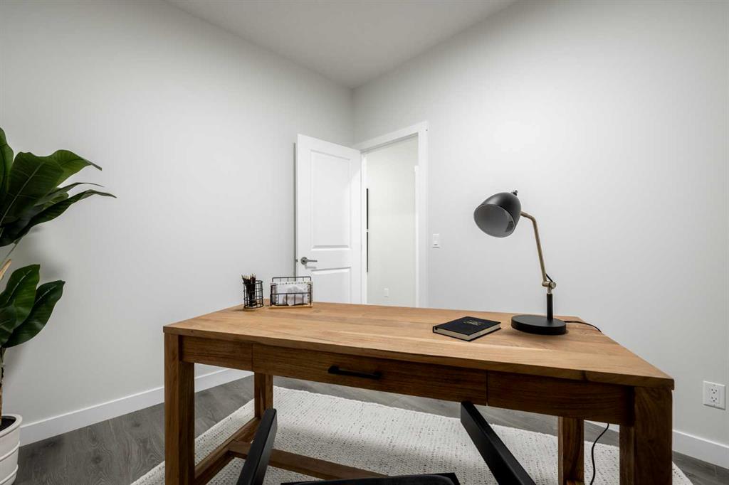 Designed with families in mind, the home features 3 bedrooms and 2.5 bathrooms, including a spacious primary retreat with a large walk-in closet and a spa-inspired 5-piece ensuite complete with double vanity, soaker tub, and separate shower. The main floor is bright and welcoming with 9’ ceilings, quartz countertops throughout, a dedicated den/home office, and a stylish electric fireplace that anchors the living space.