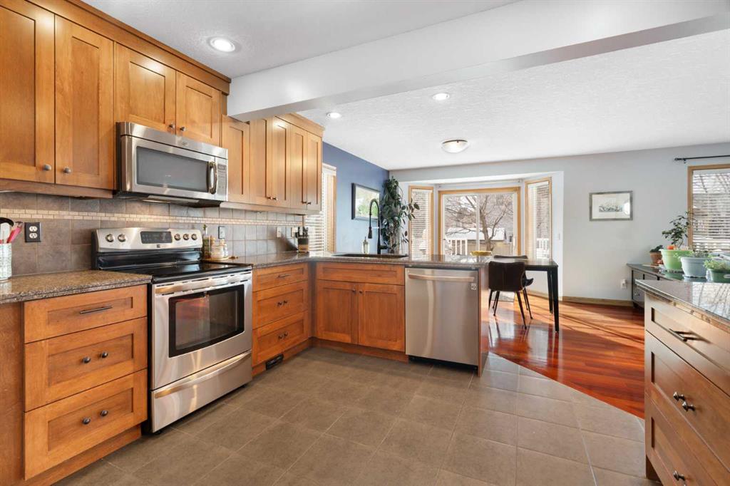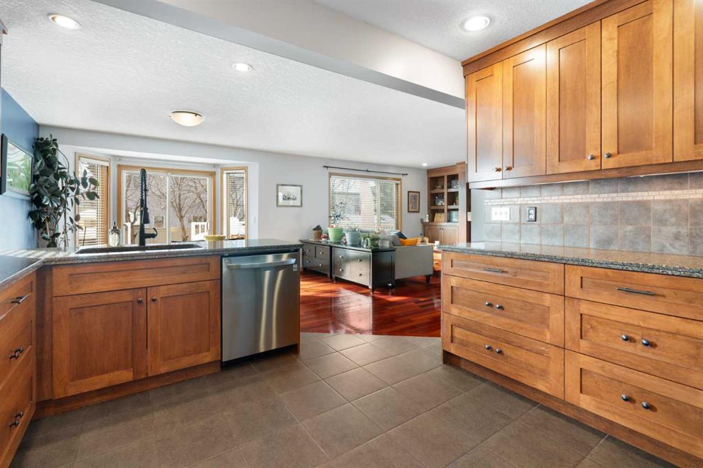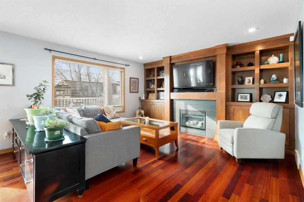 Rich Brazilian Jatoba hardwood floors, warm neutral tones, and expansive windows create a bright, inviting main level. The renovated kitchen features a generous island, corner pantry, ample prep space, and an open layout that flows seamlessly into the dining area and living room. A feature fireplace with custom built-ins anchors the space, while patio doors lead to a private south-facing backyard with deck and mature landscaping — ideal for enjoying long summer evenings.