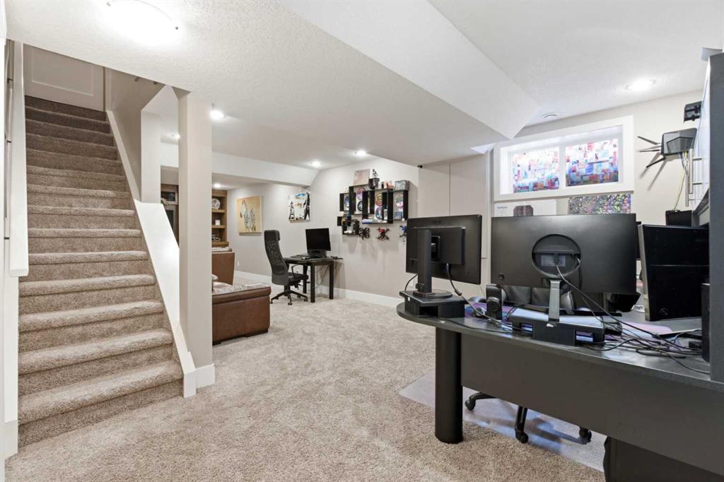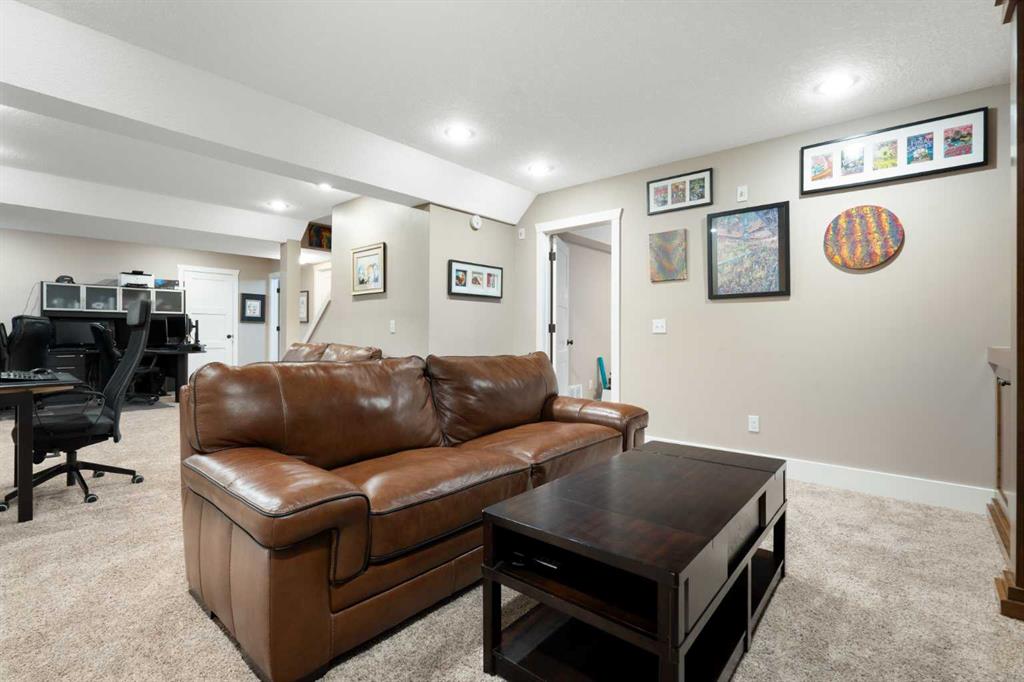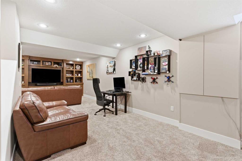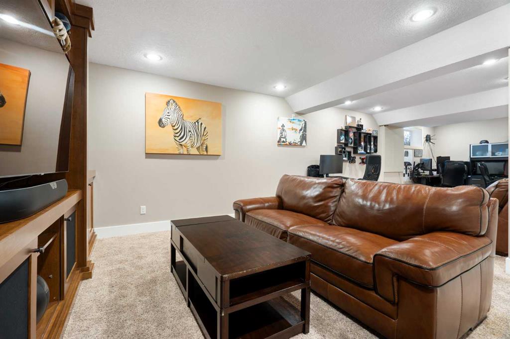 The fully developed basement adds versatility with a substantial recreation space, built-in media unit, fifth bedroom, and full bathroom with tiled shower — ideal for guests or multigenerational living.