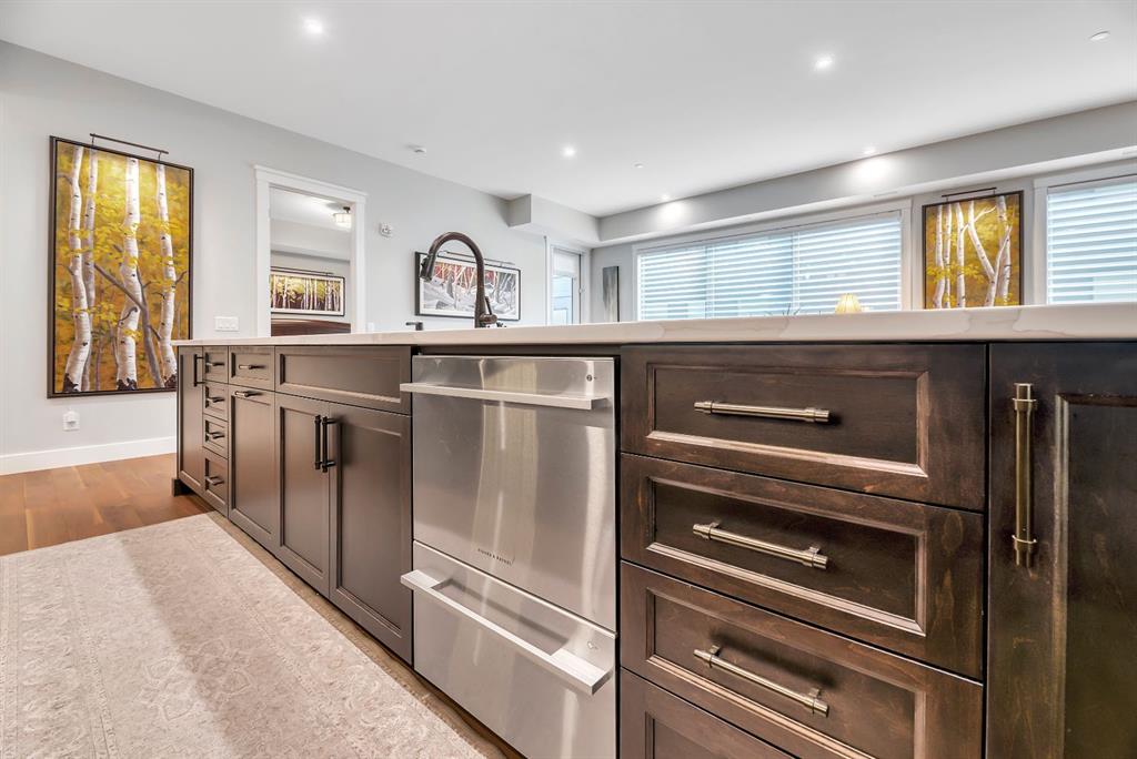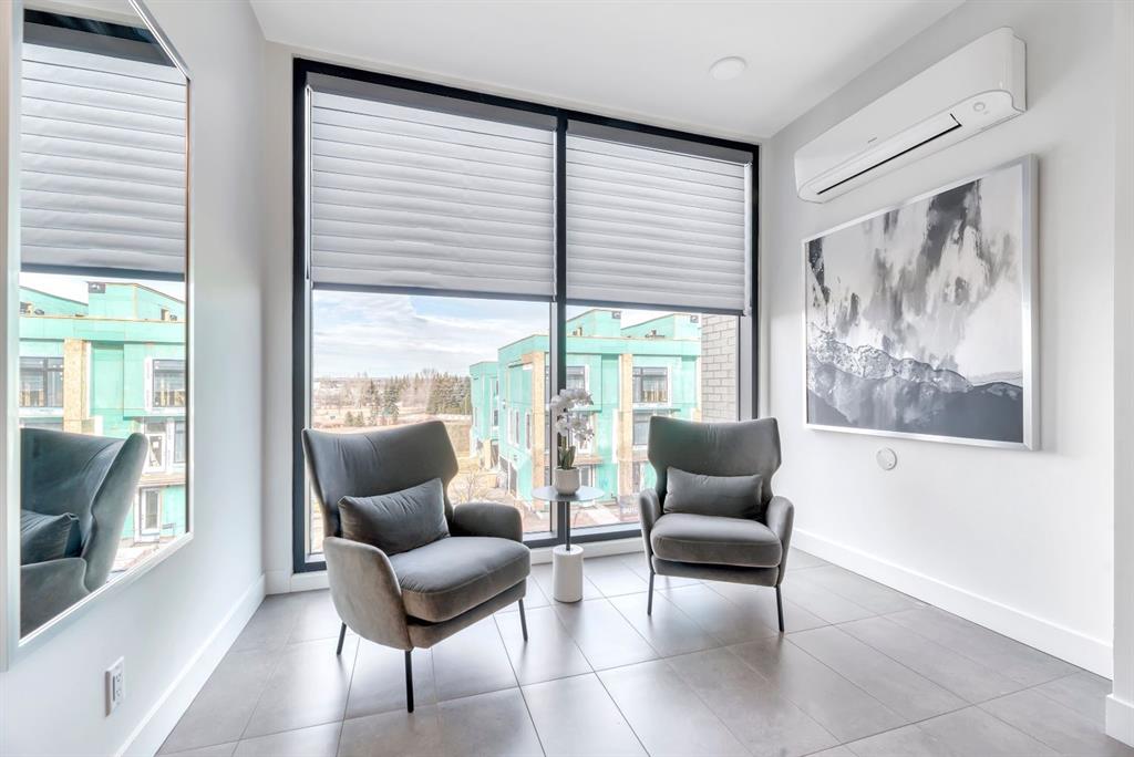 Welcome to Luxury Lock and Leave Living in the Heart of the vibrant and happening University District - and can you believe that you have exceptional condo living with an attached Private and Heated Garage for your vehicle! Not that you will need your vehicle much because everything you need is within short walking distance away, from 2 dog parks, miles of walking paths and green spaces, cafes, restaurants, grocery store, business district with numerous medical offices, lawyers, vet and pet clinics and the list goes on an on. When you are not out walking in this welcoming community, you can be enjoying this beautiful 1230 square foot, 2 bed, 2 bath executive condo in the coveted Capella Stacked Flats open-concept layout where 10’ ceilings and large windows create an airy, elevated atmosphere. High end finishes include gorgeous engineered Walnut hardwood floors throughout, chef-inspired kitchen complete with a 13.5' long, oversized island, upgraded cabinetry, premium Fisher & Paykel appliances, a custom built-in wall pantry, a dedicated tech center, undermount lighting for ambience and a tasteful Herringbone pattern backsplash. The spacious dining and living area makes it easy to host gatherings or enjoy a quiet night around the fireplace. This home has a sunny South facing balcony with a Phantom screen door and a gas line for a BBQ. There is also a water line on the patio to help keep your plants or flowers fed. The primary bedroom offers a custom walk-in closet, tray ceilings and spacious ensuite with dual sinks, a beautifully tiled shower with bench, cozy heated floors, and generous storage and counter space. The second bedroom doubles beautifully as a home office or guest suite with the other 3 pc bath directly across fitted with heated floors and another tiled shower. This space also houses the On demand Navien hot water tank and HRV with humidifier, neatly tucked away in its own storage closet. A rare luxury in condo living, this unit includes its own oversized, private heated garage—providing security, storage, and ease of entry. There is a handy workbench with cabinetry, windows along the side for natural lighting and epoxy floors as well as a convenient water line. Designed with quality, sustainability, and lifestyle in mind, this LEED-certified building offers a boutique living experience with only eight units per building and just two neighbours on your floor. Each unit has its own heating, ventilation and air conditioning systems. Also included is a premium fitness center for residents use and lovely garden and patio areas throughout the complex. A true standout home in one of NW Calgary’s most desirable communities—Experience an unbeatable work-life balance when you call this best-selling urban community home.