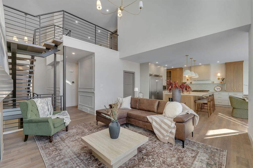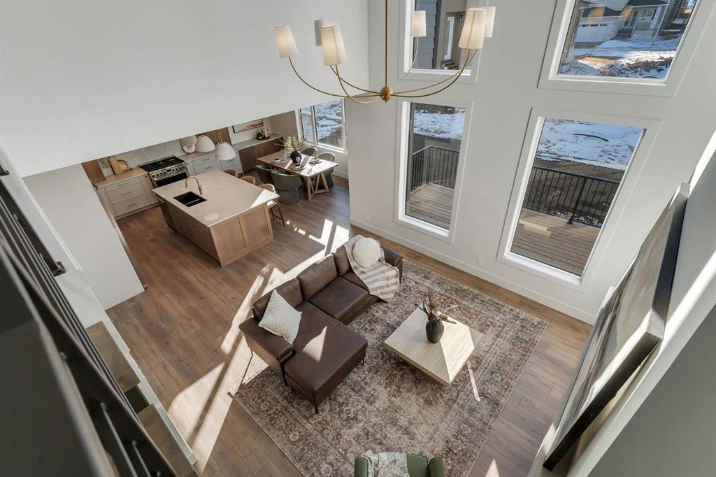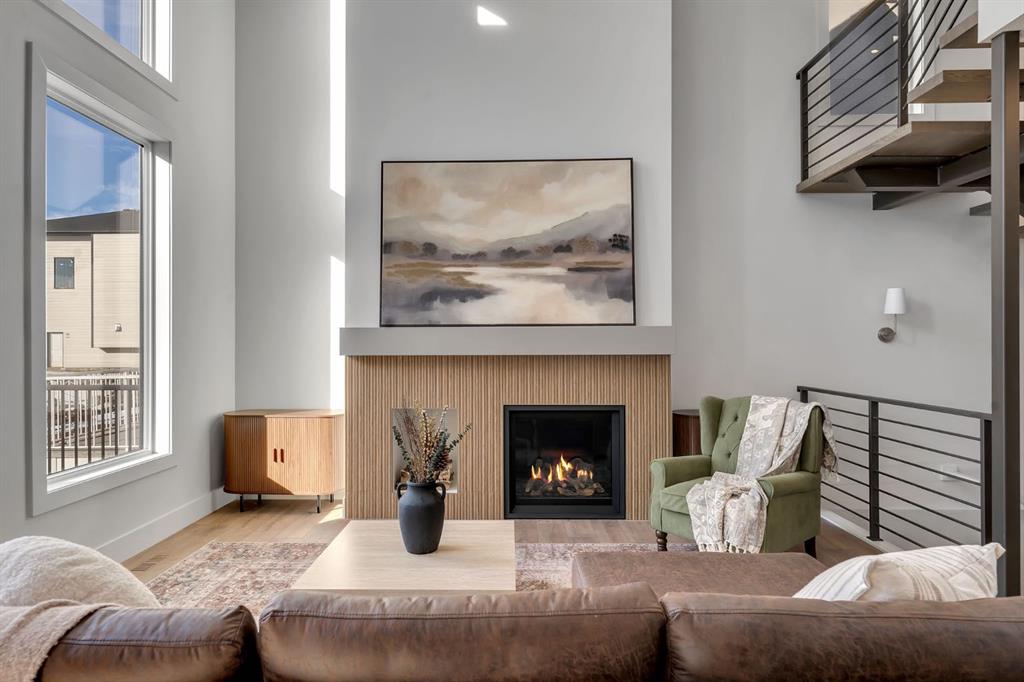 Hardwood flooring flows across the main level, guiding you into a dramatic open-to-below living space framed by expansive west-facing windows. Light pours in, enhancing the fireplace feature wall and amplifying the sense of volume and openness.