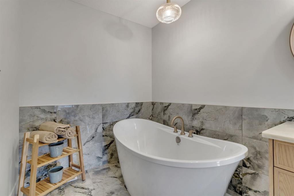 Upstairs, open metal railings overlook the main level, leading to a generous bonus room with a dedicated media wall and an upper laundry room for convenience. The primary retreat is thoughtfully designed with a privacy feature wall, open closet concept with built-in wood shelving, and a spa-inspired ensuite featuring a freestanding tub, double vanities, fully tiled shower with bench and niche detailing, and refined brass fixtures throughout.