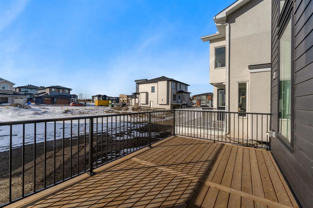 Outside, a finished deck with metal railings extends onto a wide lot, just minutes from Chestermere Lake, East Hills Shopping Centre, parks, and playgrounds.