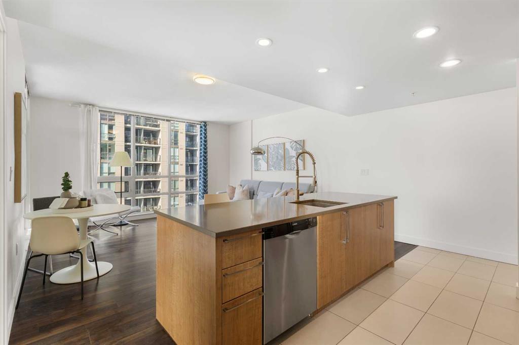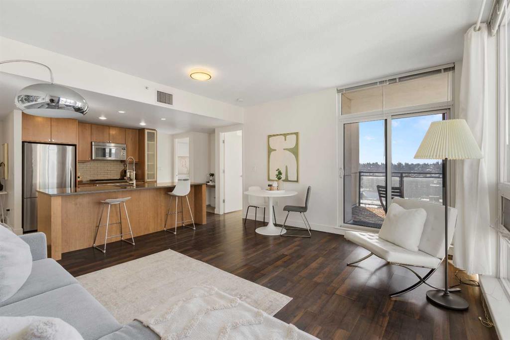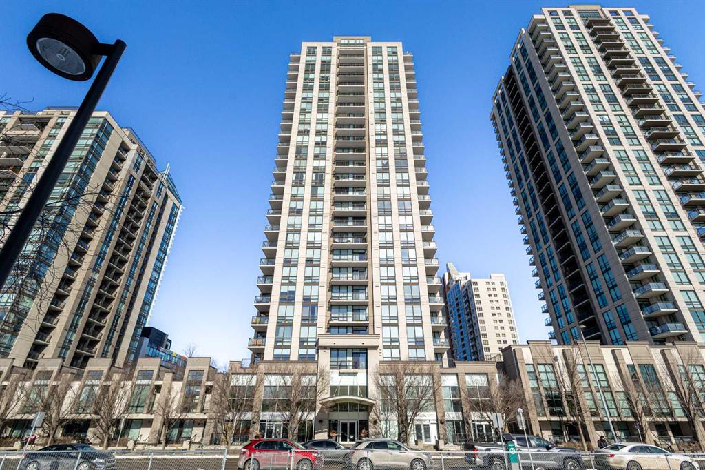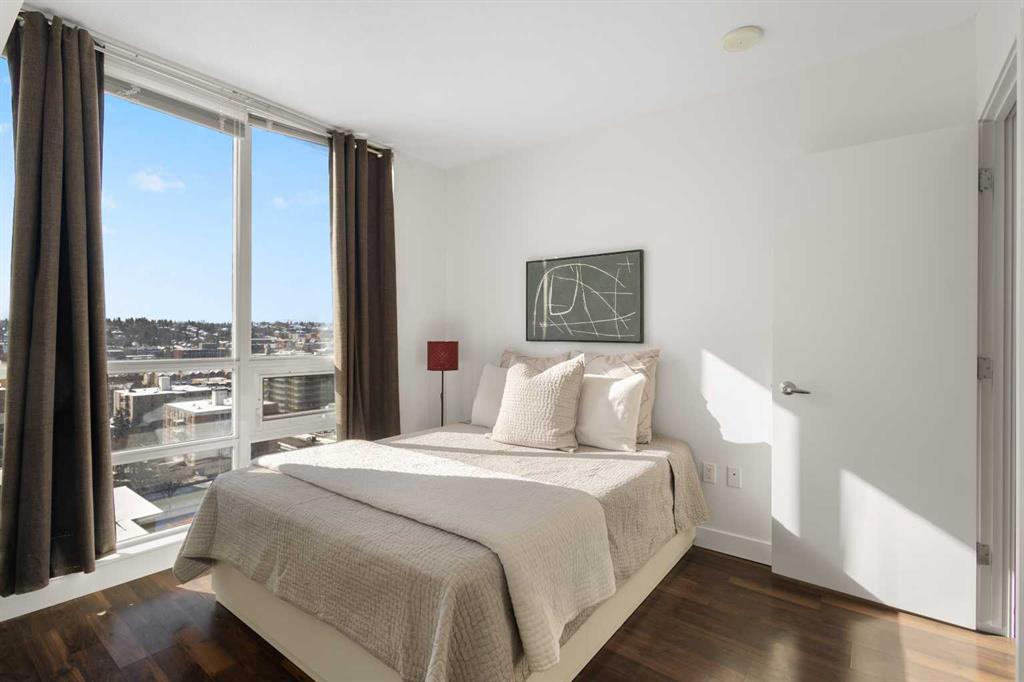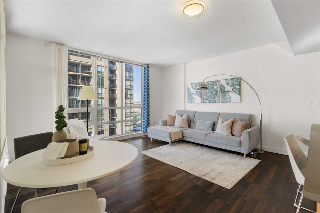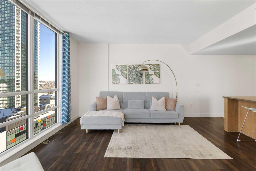 Imagine waking up to golden sunlight pouring through floor-to-ceiling windows, Rocky Mountain sunsets painting your evenings, and everything you love about Calgary just steps from your door. This is THE home. Nestled in the heart of Beltline/Downtown West neighbourhood, this meticulously maintained 2-bedroom, 2-bathroom corner home is move-in ready at the highly sought-after Nova building. Complimentary premium furnitures are included, making it perfect for families and young professionals alike. Offering 864 SF of thoughtfully-designed open-concept living space, this bright and sunny unit is bathed in natural light with stunning southwest-facing views. Concrete construction with excellent soundproofing and a peaceful school-facing orientation mean you'll truly feel at home with calm and quiet. The warm neutral colour tones, rich laminate wood flooring, tall 9-foot ceilings, and an abundance of natural light create a space that feels elegant and effortlessly livable. The year-round central heating and cooling keeps you perfectly comfortable in every season. The spacious living and dining areas flow seamlessly into a premium gourmet kitchen featuring a large quartz island, Bosch gas stove and oven, dishwasher, and Fisher & Paykel refrigerator—ideal for weeknight dinners or weekend entertaining. The master bedroom is a private retreat with a walk-through closet and spa-inspired bathroom, while a well-sized second bedroom offers the flexibility to grow—guest room, home office, or space for the people you love. Central air conditioning keeps the home cool and comfortable during Calgary’s summer days