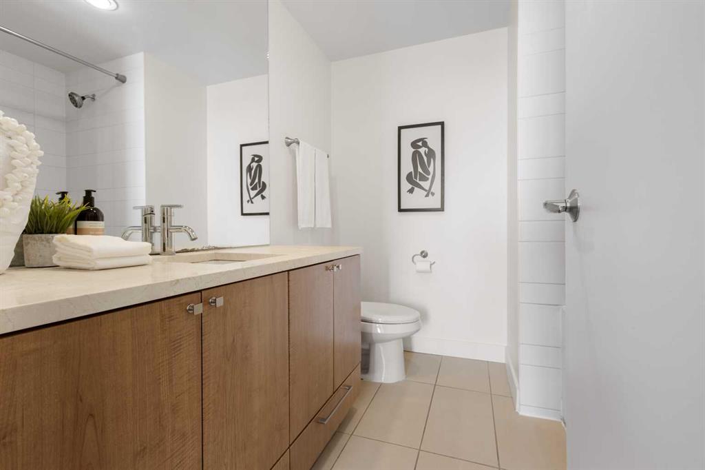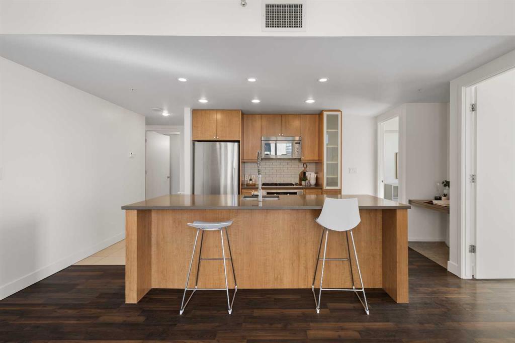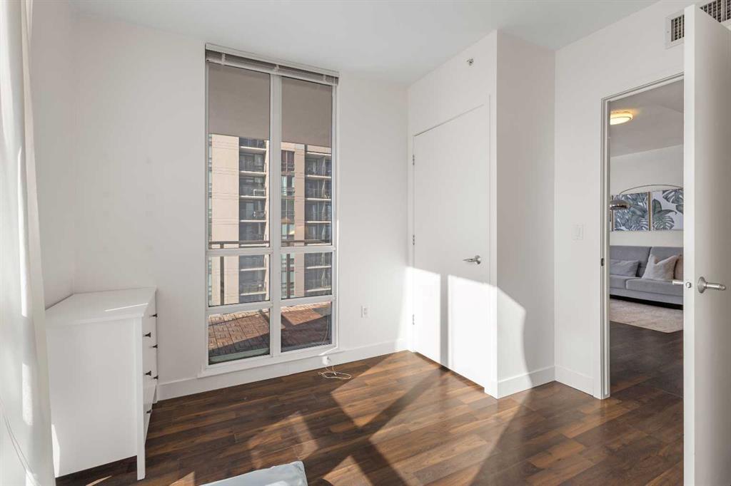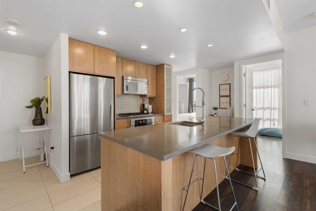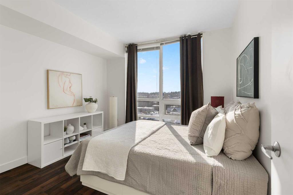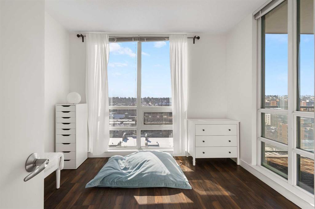Imagine waking up to golden sunlight pouring through floor-to-ceiling windows, Rocky Mountain sunsets painting your evenings, and everything you love about Calgary just steps from your door. This is THE home. Nestled in the heart of Beltline/Downtown West neighbourhood, this meticulously maintained 2-bedroom, 2-bathroom corner home is move-in ready at the highly sought-after Nova building. Complimentary premium furnitures are included, making it perfect for families and young professionals alike. Offering 864 SF of thoughtfully-designed open-concept living space, this bright and sunny unit is bathed in natural light with stunning southwest-facing views. Concrete construction with excellent soundproofing and a peaceful school-facing orientation mean you'll truly feel at home with calm and quiet. The warm neutral colour tones, rich laminate wood flooring, tall 9-foot ceilings, and an abundance of natural light create a space that feels elegant and effortlessly livable. The year-round central heating and cooling keeps you perfectly comfortable in every season. The spacious living and dining areas flow seamlessly into a premium gourmet kitchen featuring a large quartz island, Bosch gas stove and oven, dishwasher, and Fisher & Paykel refrigerator—ideal for weeknight dinners or weekend entertaining. The master bedroom is a private retreat with a walk-through closet and spa-inspired bathroom, while a well-sized second bedroom offers the flexibility to grow—guest room, home office, or space for the people you love. Central air conditioning keeps the home cool and comfortable during Calgary’s summer days