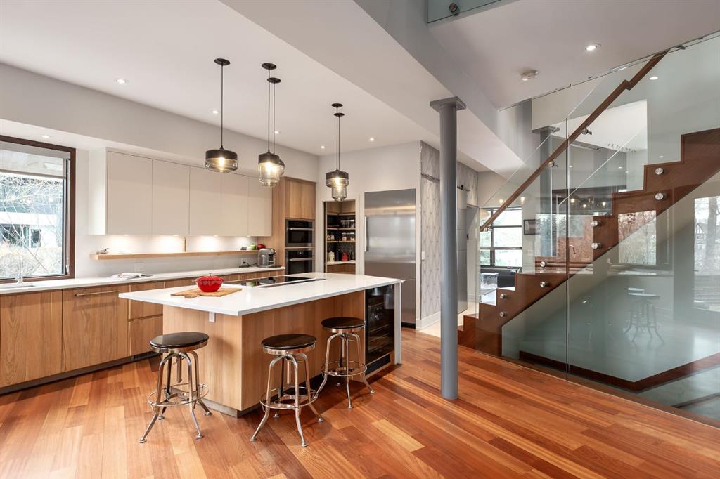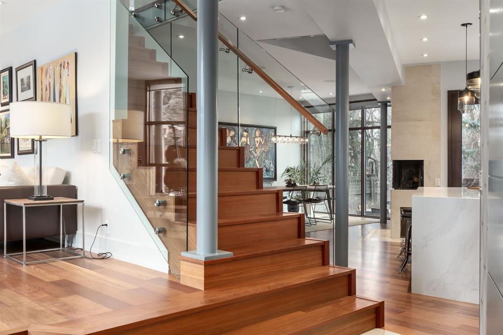 Inside, Brazilian cherry hardwood floors set the tone for timeless elegance. The main floor is designed for both connection and privacy, with a central glass staircase anchoring the layout. Enjoy the front library/den, an elegant living room, or dining with a view of the trees.