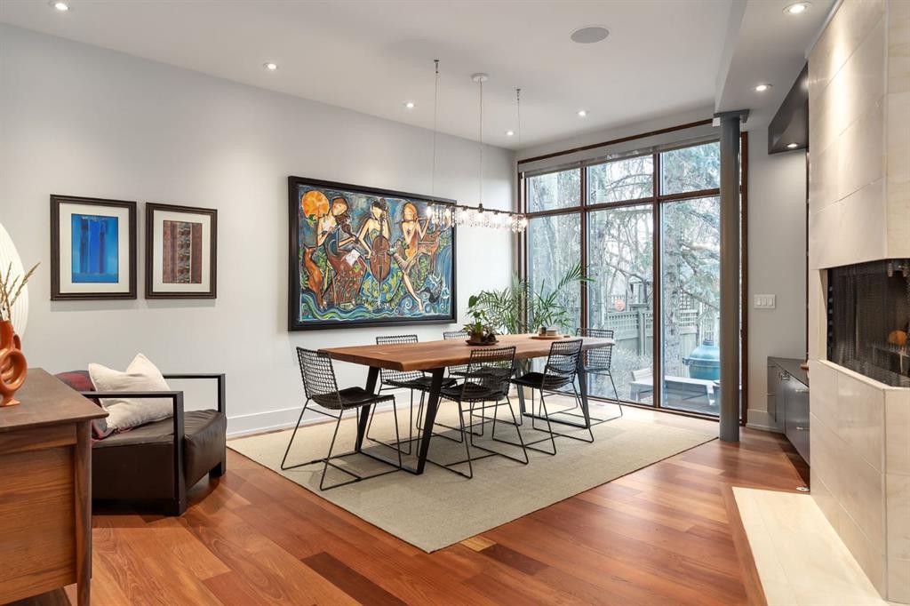 The Porcelanosa kitchen is a showpiece—flooded with natural light and overlooking the park and river. Outfitted with a full Miele appliance package, induction cooktop with hidden hood, beverage center, walk-in pantry, and Porcelanosa finishes, it’s both functional and striking. A floor-to-ceiling window and wood-burning fireplace create a warm dining atmosphere.