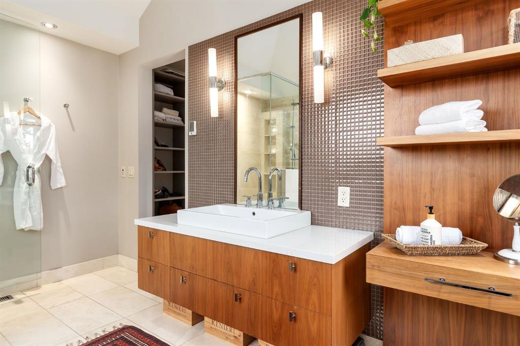 Upstairs, the southwest-facing primary retreat offers vaulted ceilings, a private balcony with river views, spa-like ensuite with natural stone, walnut cabinetry, heated floors, soaker tub, walk-in shower, and custom wardrobe system. Two additional bedrooms complete this level—one with cheater ensuite and steam shower, the other with rare river views.
