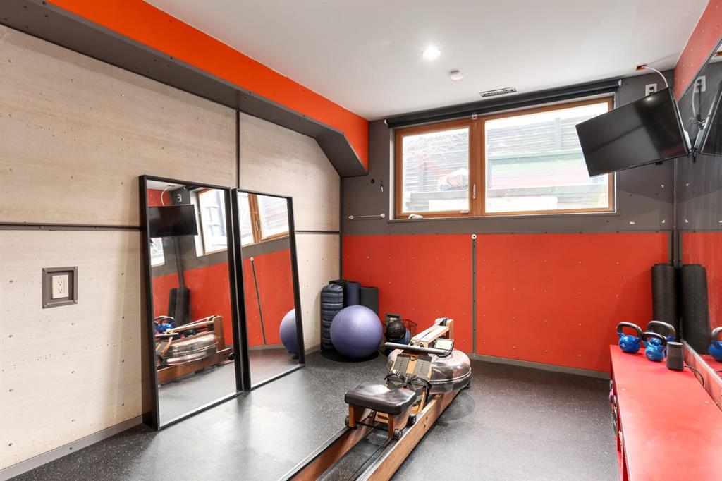 The finished basement includes a gym, rec room, 4th bedroom, full bath, laundry with sink, storage, and access to the front attached garage.
