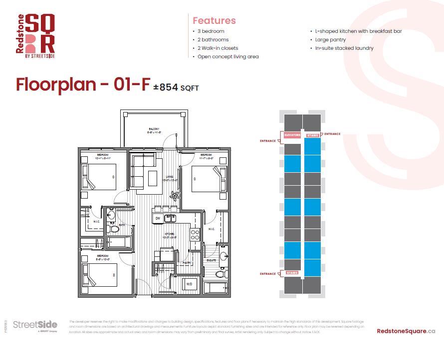 88 units range from 564sqft 1 bedroom / 1 bathroom with titled surface or underground parking, 2 bedroom /1 or 2 bathroom units, all the way up to 906sqft 3 bedroom / 2 bathroom units with titled surface or underground parking. This unit is a 3 Bedroom 2 Bathroom with Titled underground parking.