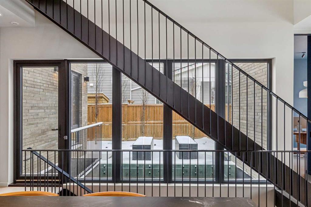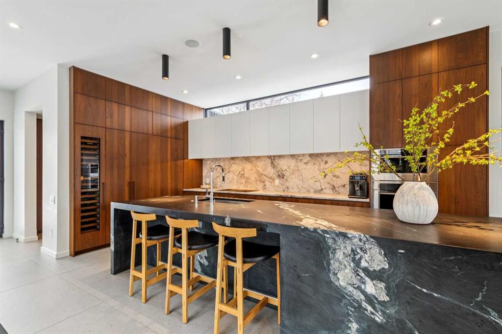 A rare opportunity to own a Bioi-designed architectural residence, featured in Western Living + specifically crafted for modern indoor-outdoor living. Extraordinary natural light, anchored by a striking two-storey light well and a private south-facing backyard on a quiet street. Dramatic sunken living room with interior brick, walnut millwork + a concrete ribbon fireplace with hidden TV + integrated cabinetry. Full-height glazing brings outstanding natural light, complemented by large-format ceramic flooring + rich walnut detailing throughout. Kitchen: integrated appliances, expansive island, Sub-Zero wine fridge, Wolf appliances + soapstone and marble counters. Office: 12-foot ceilings, floor-to-ceiling windows, automated blinds, pocket reeded glass door + custom walnut built-ins. Upstairs: three bedrooms including children’s rooms with built-in desks, plus a serene primary retreat with built-in closet system + a skylit shower. Lower level: bright two-storey west light well, large playroom, generous storage + an additional bedroom with full-height window. Outdoor living: south-facing, fully landscaped yard with a striking cantilever creating a covered concrete patio lounge with outdoor kitchen, firepit, + irrigation for easy maintenance + two custom steel garden beds. Comfort + efficiency: radiant heat, air conditioning, upgraded natural wool carpet, electric vehicle charging ready + European tilt and turn windows. Double garage + a spacious exterior gym. Walk to the Glemore Reservoir pathway system, River Park, tennis, pool + arenas.