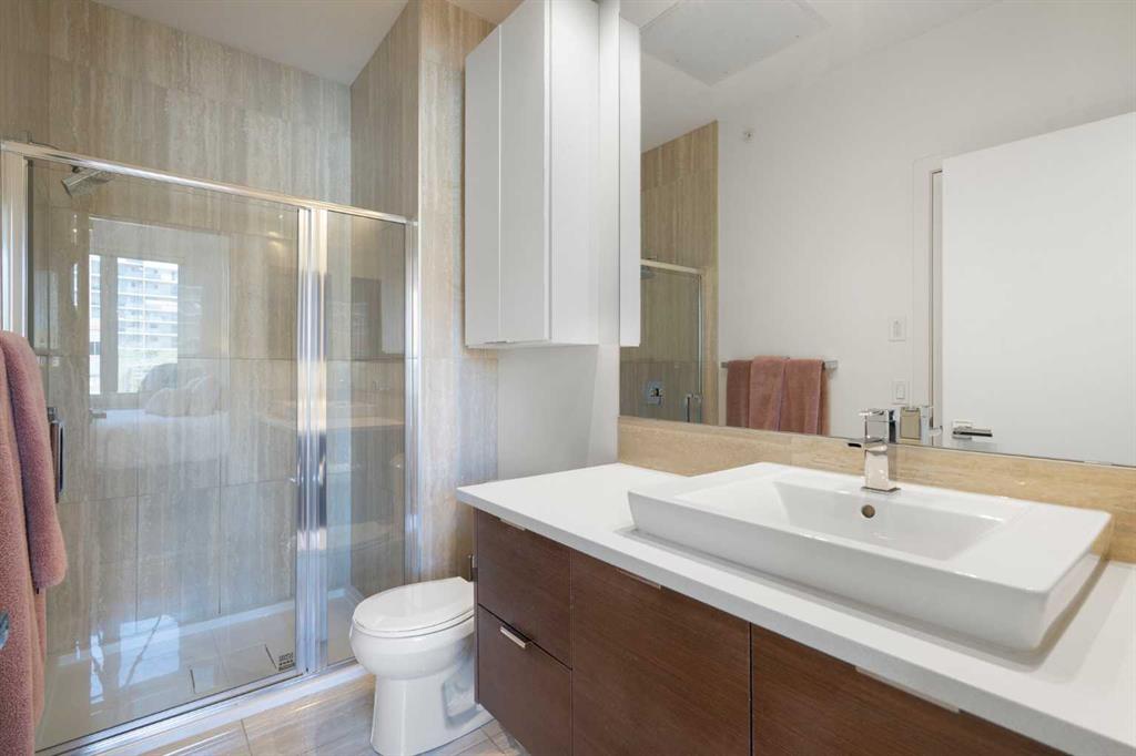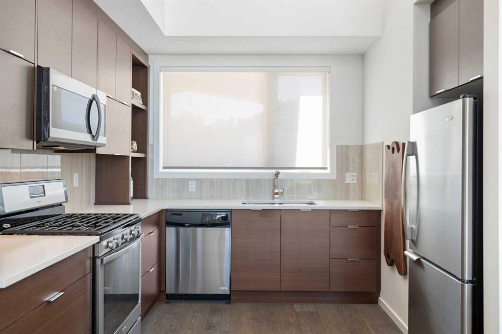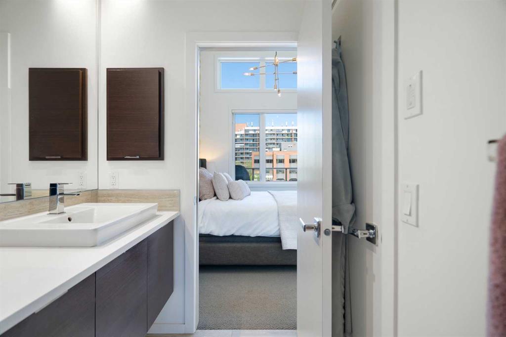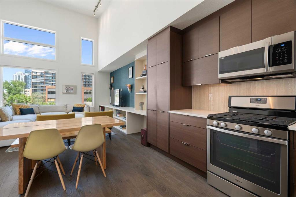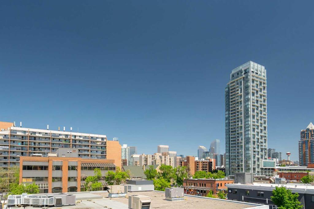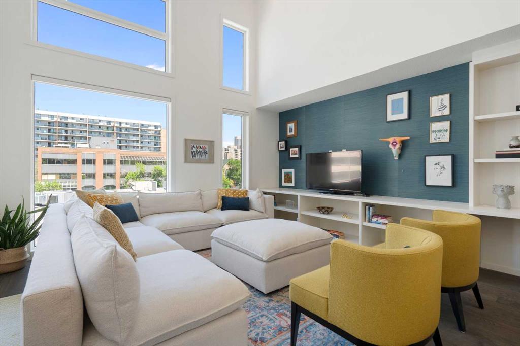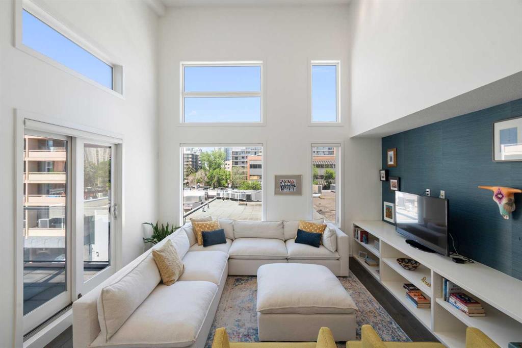 Welcome to The Block, one of Calgary’s most architecturally distinctive communities just off vibrant 17th Avenue. Designed by Sturgess Architecture and built by Avi Urban, this boutique development is known for its rare private courtyard concept — each residence opens directly to the outdoors, creating a sense of community, privacy, and independence that’s truly unmatched in the downtown core.This top-floor penthouse loft is one of the most desirable suites in the complex. Soaring 14’ vaulted ceilings and hardwood floors throughout create an airy, dramatic living space, while massive windows flood the home with natural light. A custom wall of built-ins anchors the living room with both style and functionality. The sleek kitchen features stainless steel appliances, lacquered cabinetry, and generous storage — perfect for both everyday living and entertaining. Step out onto your private deck with city views, complete with gas access for easy BBQ evenings. The spacious primary bedroom offers large windows and convenient access to a beautifully appointed bathroom with walk-in glass shower and modern vanity. The second bedroom is thoughtfully designed with a full wall of built-in storage, making it ideal for guests, a home office, or both. Complete with titled parking, additional storage, built-in laundry, and air conditioning, this is effortless urban living at its finest. Now offered at a significantly improved price, this penthouse represents outstanding value in one of Calgary’s most dynamic inner-city locations. Don’t miss your opportunity to experience The Block at its very best.