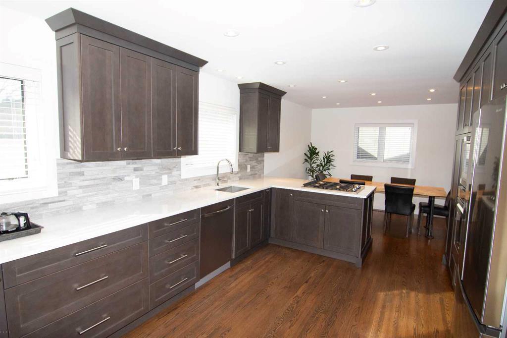 Welcome to the highly sought-after community of Lake Bonavista, one of Calgary’s most desirable neighbourhoods, offering exclusive lake access with year-round activities such as swimming, skating, and paddle boarding just moments from your doorstep. This inviting home features multiple living areas throughout, providing both functional space and room to grow, and has been continuously maintained and thoughtfully updated over the years. Recent improvements include refinished hardwood flooring on the main level and a beautifully renovated kitchen featuring Legacy Kitchen cabinets, quartz countertops, a breakfast bar overlooking the family room, tile backsplash, and stainless steel appliances including a downdraft cooktop. Additional upgrades include smooth ceiling finishes, updated light fixtures, a renovated ensuite bathroom with a spacious shower, and an updated main upper bathroom complete with a large soaker tub. The sunken family room off the kitchen offers a cozy wood-burning fireplace with built-in bookshelves on both sides and sliding doors that open to a concrete patio and sunny south-facing backyard. A convenient side entry leads to a 2-piece bathroom, laundry area, and a versatile bedroom or den. The basement includes a large recreation room, office, gym area, two storage areas, and an egress window. Outside you’ll find a newer insulated double detached garage with an electric door opener, breaker panel, and concrete floor, along with landscaped front and rear yards, front and rear concrete walkways, and a generously sized tool shed. Additional highlights include modern vinyl windows throughout, including a bow window in the living room and sliding glass doors in the family room. Ideally located close to the lake, excellent schools, parks, playgrounds, off leash walking area close by, shopping, and dining, this home is also just minutes from major routes, Southcentre Mall, and the LRT. Don’t miss this exceptional opportunity—call today to book your private viewing.