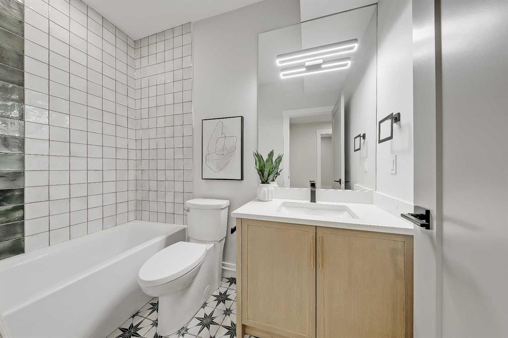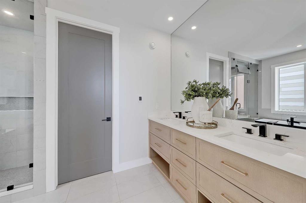 Upstairs, a central bonus room anchors the bedrooms. The primary retreat offers an 11-ft ceiling, private balcony with DOWNTOWN VIEWS, boutique-style walk-in closet, and a spa-inspired ensuite with heated floors, dual vanities, freestanding soaker tub, and STEAM shower. Two additional bedrooms include walk-in closets and private 4-pc ensuites. A fully appointed laundry room adds practical convenience.