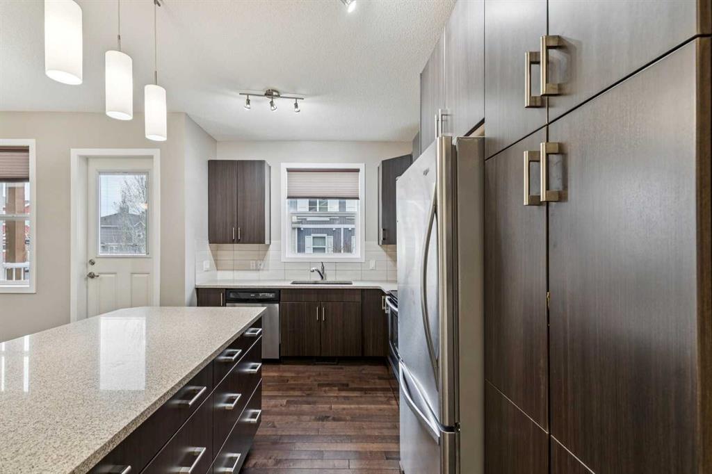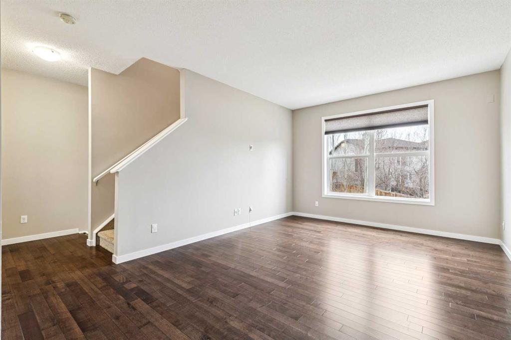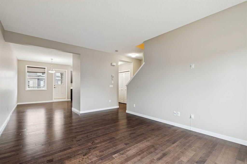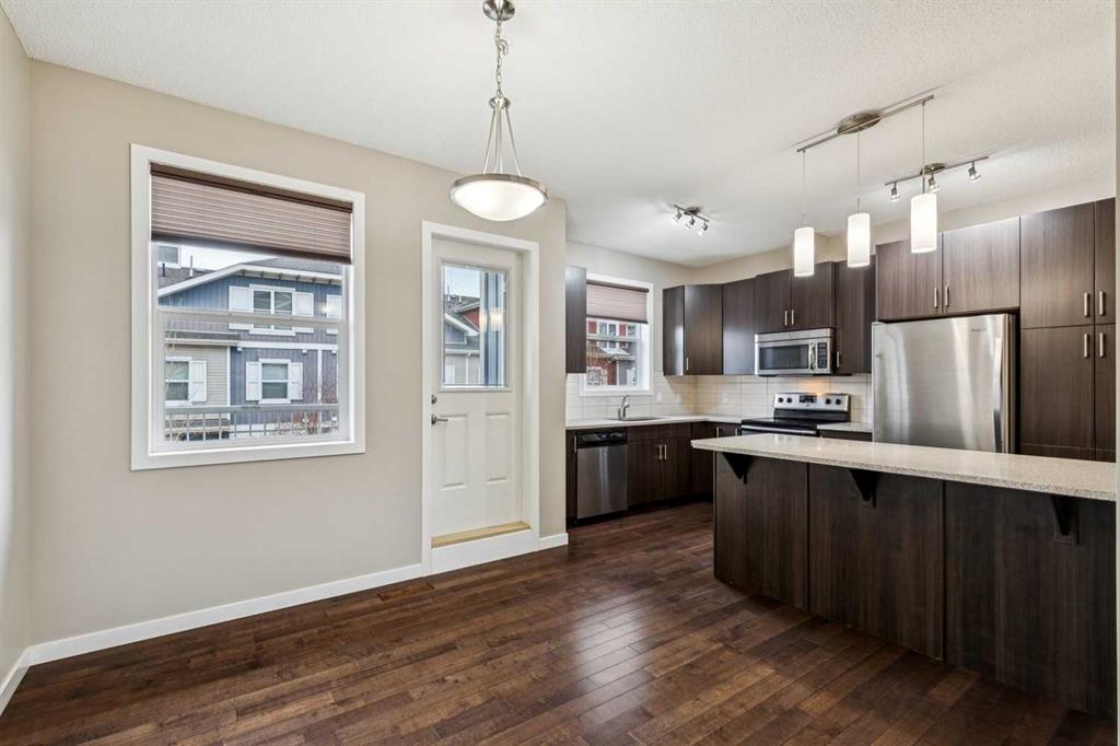 Welcome to this well-maintained and thoughtfully upgraded bareland condo townhome in the desirable Chesapeake complex of Auburn Bay. Situated in the complex directly across from Auburn Bay School, this home has easy access to nearby green space and playgrounds. It is the perfect location for a family! As you enter the unit, the entry level features a few steps downwards to the attached double garage and driveway, along with a versatile family room space and a utility room with laundry. Upstairs, the main floor showcases hardwood flooring throughout, enhanced by fresh paint and abundant natural light. The spacious living room is anchored by a large window, while the kitchen stands out with quartz countertops, extended-height cabinetry, upgraded backsplash, garburator, and ample storage. The adjacent dining area opens directly onto a balcony with a door featuring built-in mini-blinds—perfect for easy indoor-outdoor living. A convenient half bath completes this level. The upper floor offers three bedrooms, including a primary retreat with a ceiling fan, walk-in closet with a practical 4-shelf sweater tower, and a stylish 3-piece ensuite featuring a full-height tiled shower with sliding glass doors, Moen fixtures, and a vessel sink. Additional upgrades include tile flooring in bathrooms and entryways, and a recently installed high-efficiency two-stage furnace (2026) with a 10-year warranty for added peace of mind. Outside, enjoy both a welcoming front porch and a patio space for relaxing or entertaining.