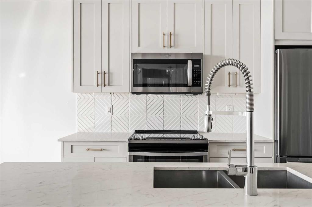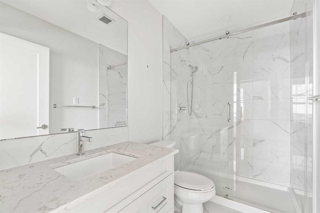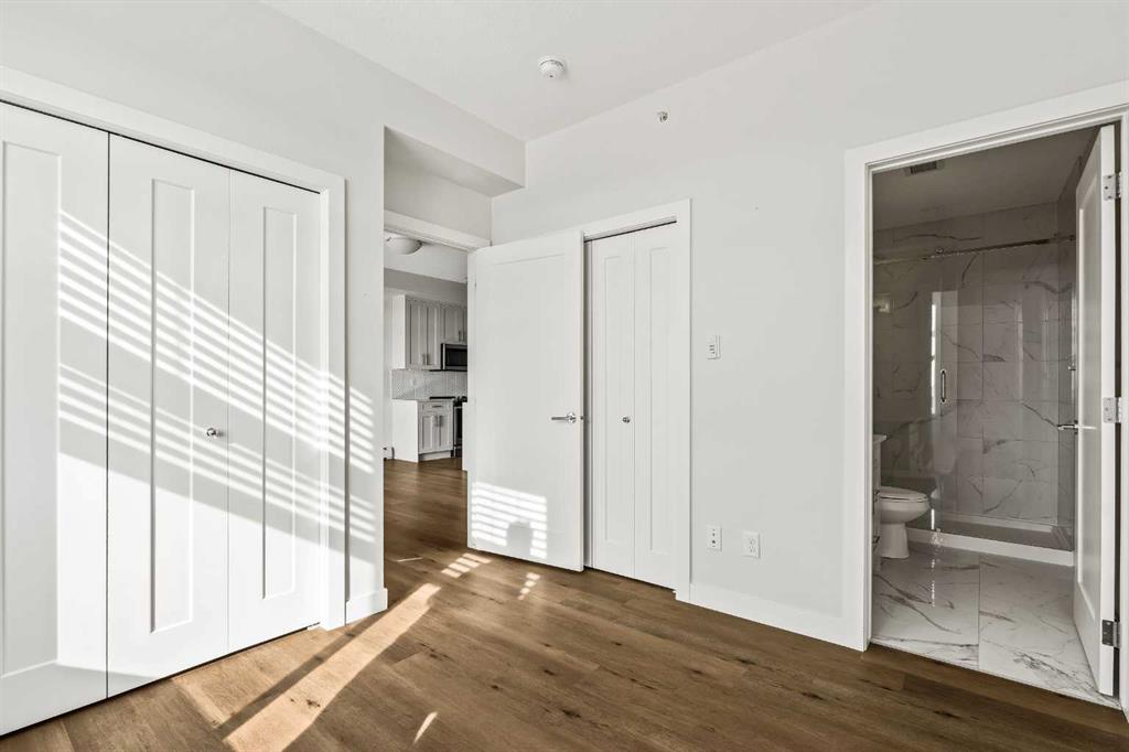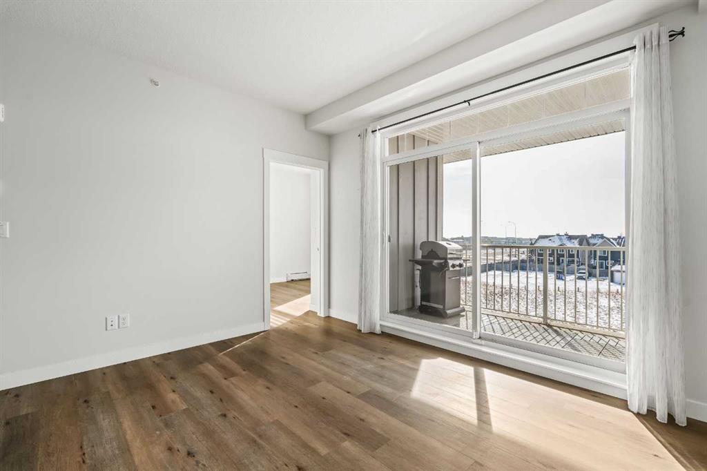 Perched on the top floor in Auburn Bay, this beautifully executed, south facing, two-bedroom, two-bath condo offers a bright, modern layout with thoughtful upgrades throughout and overlooks a lush greenspace. As you step in, vinyl plank flooring runs seamlessly through the home, creating a clean, contemporary look that’s as durable as it is stylish. The layout opens into the main living space, drenched in natural light, where the living and dining areas connect effortlessly to a well-designed kitchen, perfect for your everyday routines to easy entertaining. Crisp white cabinetry, quartz countertops, stainless steel appliances, and a striking geometric backsplash give the kitchen a fresh, polished finish, while the oversized island offers generous prep space and room to pull up a few stools. Just off the kitchen, the tucked-away laundry room with a stacked washer and dryer keeps the practical details out of sight, but close at hand. From the living room, step onto your private balcony overlooking an expansive greenbelt. With a gas line for your BBQ, the spacious balcony feels like an outdoor extension of the kitchen, perfect for casual dinners, morning coffee, or unwinding at the end of the day with a glass of wine. The primary suite is calm and comfortable, featuring a large window and plenty of closet space for streamlined storage, along with a luxurious ensuite bath. The second bedroom offers flexibility for guests, a home office, or a child’s room, and is conveniently located near the full main bath, complete with quartz counters. Air conditioning and a titled parking stall are understated conveniences you’ll appreciate year-round. The location is hard to beat: Auburn Bay offers coveted lake access, parks, playgrounds, schools (public and Catholic), a water park and tennis courts, plus quick access to South Health Campus, shopping, restaurants, Deerfoot, and Stoney Trail.