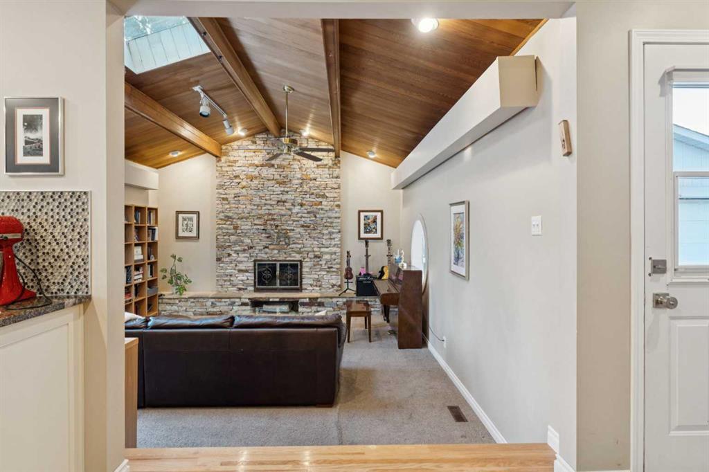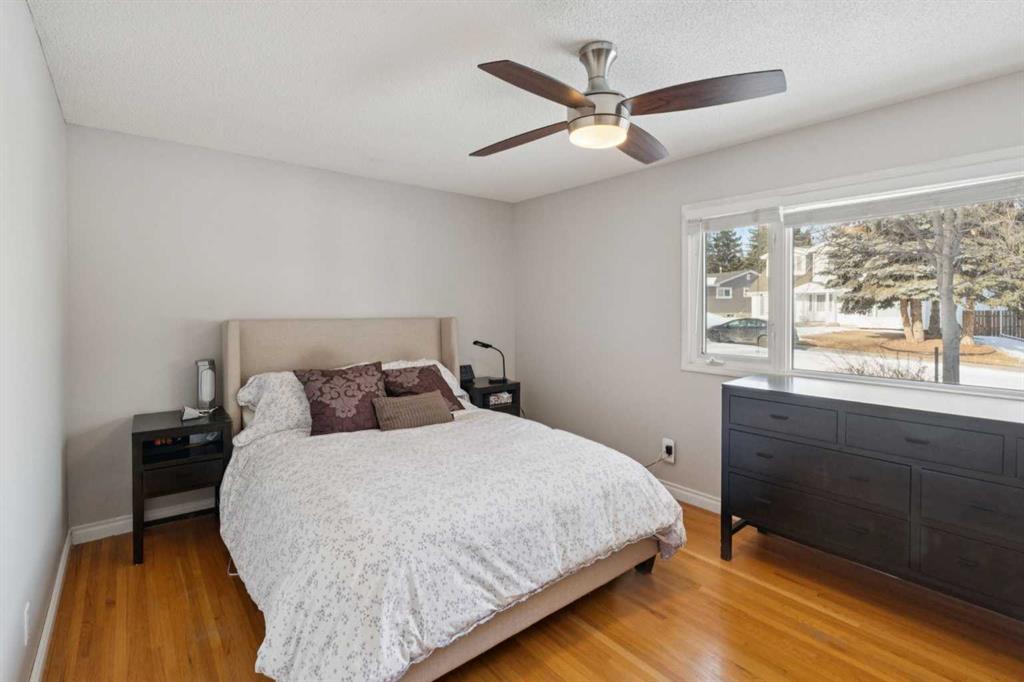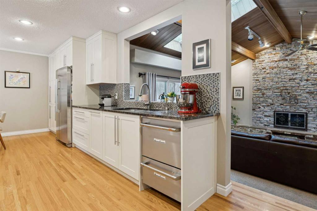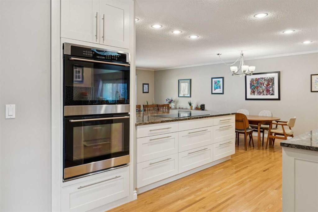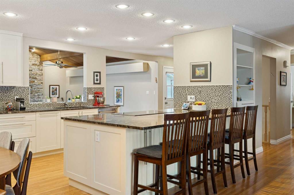 RARE FIND! Beautifully maintained and upgraded, this 3+2 bedroom bungalow offers 2,919 SF of developed living space featuring a 315 SF vaulted family room addition with open-beam ceiling and a striking floor-to-ceiling stone fireplace. A tremendous benefit to this reno was the ability to expand in to a custom kitchen (2010) that is absolutely stunning, showcasing an abundance of custom cabinetry, stone counters, breakfast bar and stainless steel appliances including double ovens making this kitchen a Chef’s dream. Additional highlights include hardwood floors which run through the main living areas and bedrooms, updated main bathroom (2017), modern interior finishing and large upgraded windows. The basement is finished with two additional bedrooms, a newer 4 piece bathroom, hobby/rec space, storage and laundry. Major exterior and mechanical updates include Hardie board siding (2019), new roof on both the house and garage (2019), central A/C (2018), hot water tank (2016), R40 insulation, and 90% window replacement. Situated on a large pie-shaped lot with a detached, oversized double garage (23'x21') and walking distance to Louis Riel School, community center, parks, and pathways—this is an exceptional opportunity to own a turnkey home in one of Calgary’s most established, family-friendly neighborhoods.