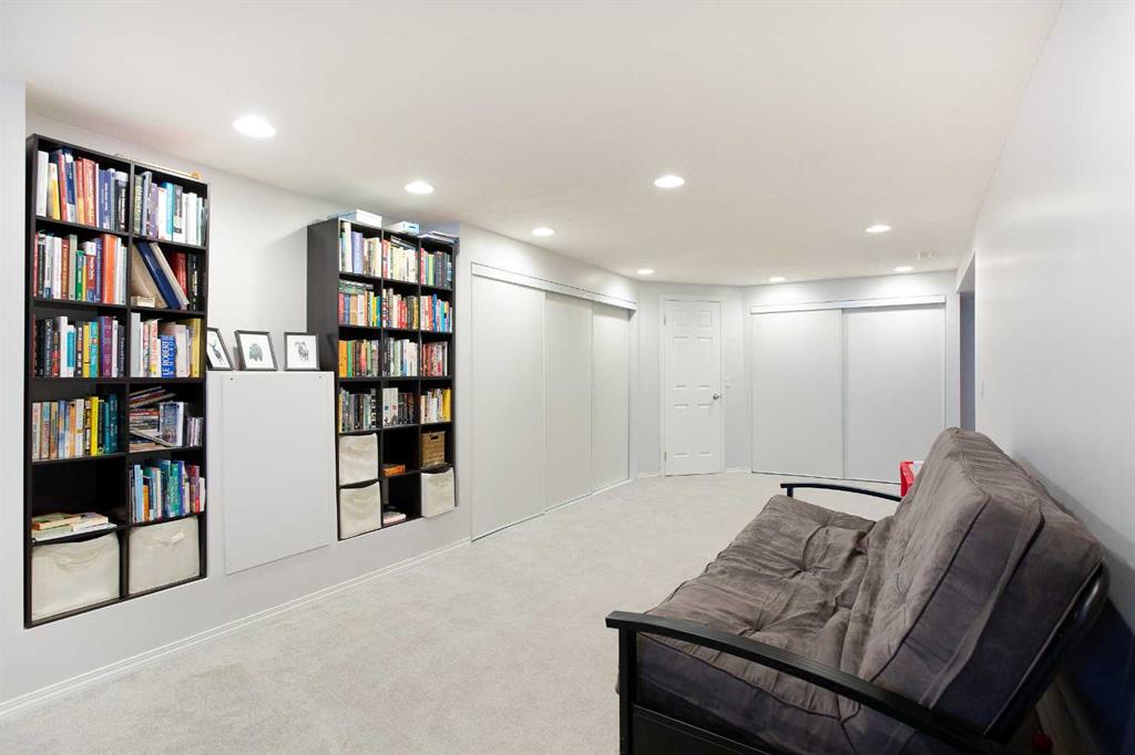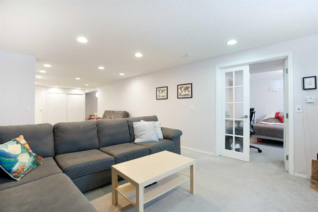 Downstairs, the fully developed lower level expands your living space with a massive family and games area, perfect for watching television, with plenty of space for a kids’ playroom or yoga area, complete with a gas stove-style fireplace. A fourth bedroom with its own three-piece ensuite adds privacy for guests. The spacious laundry area includes tile flooring, ample storage, and a versatile hobby or crafting space. The washer and dryer complete the room.