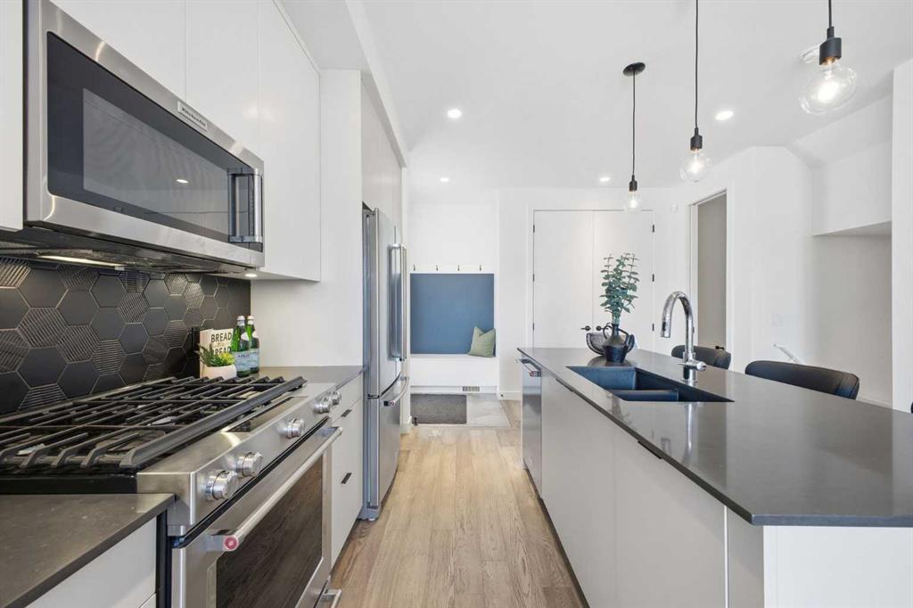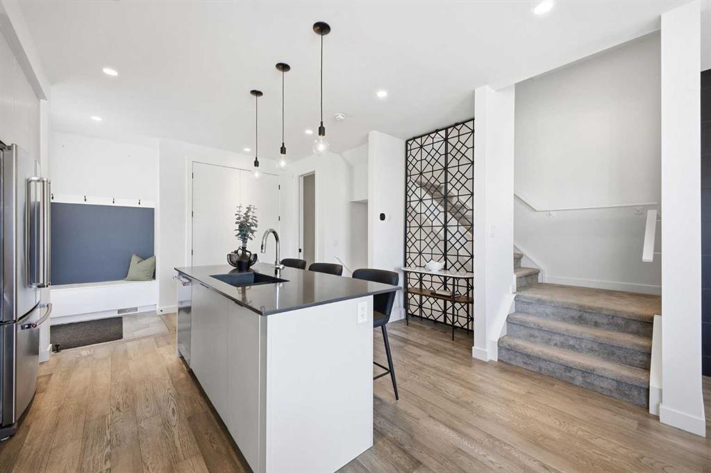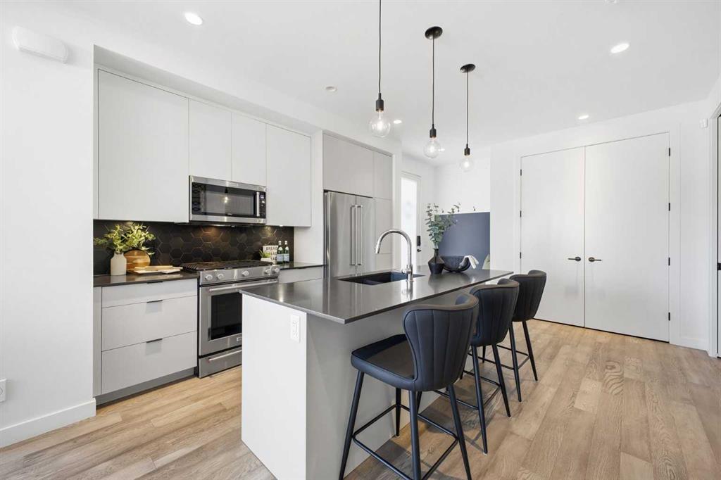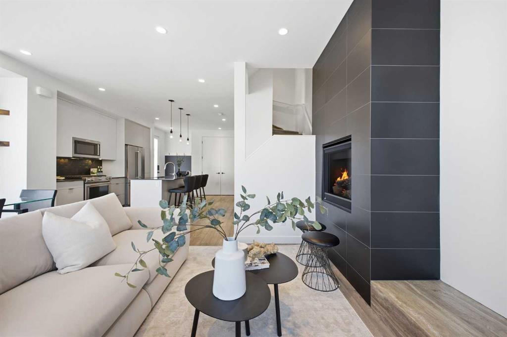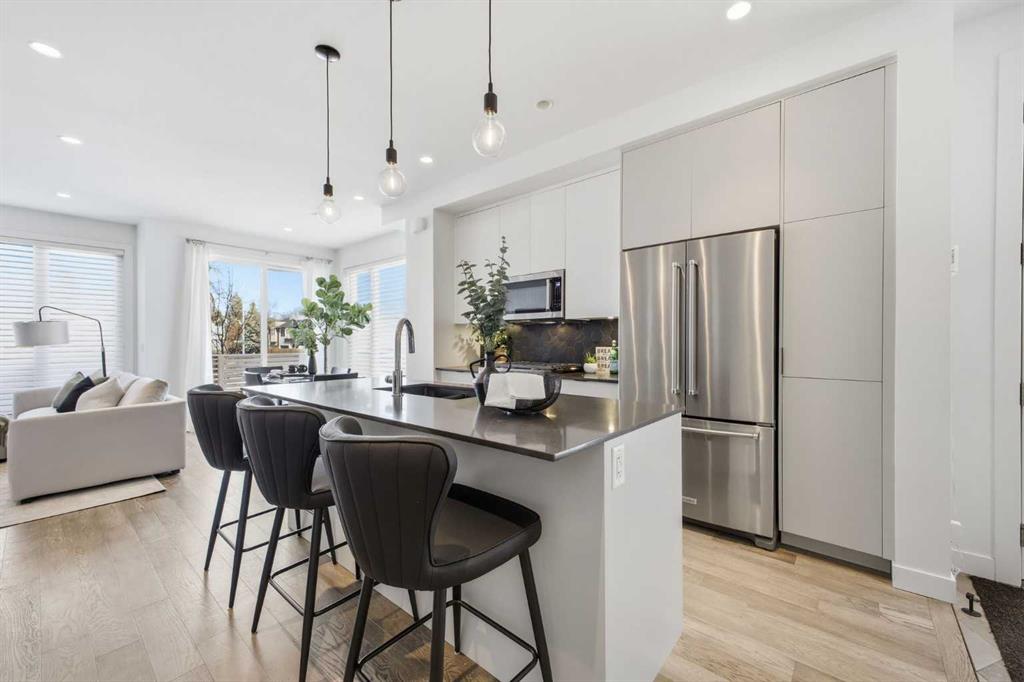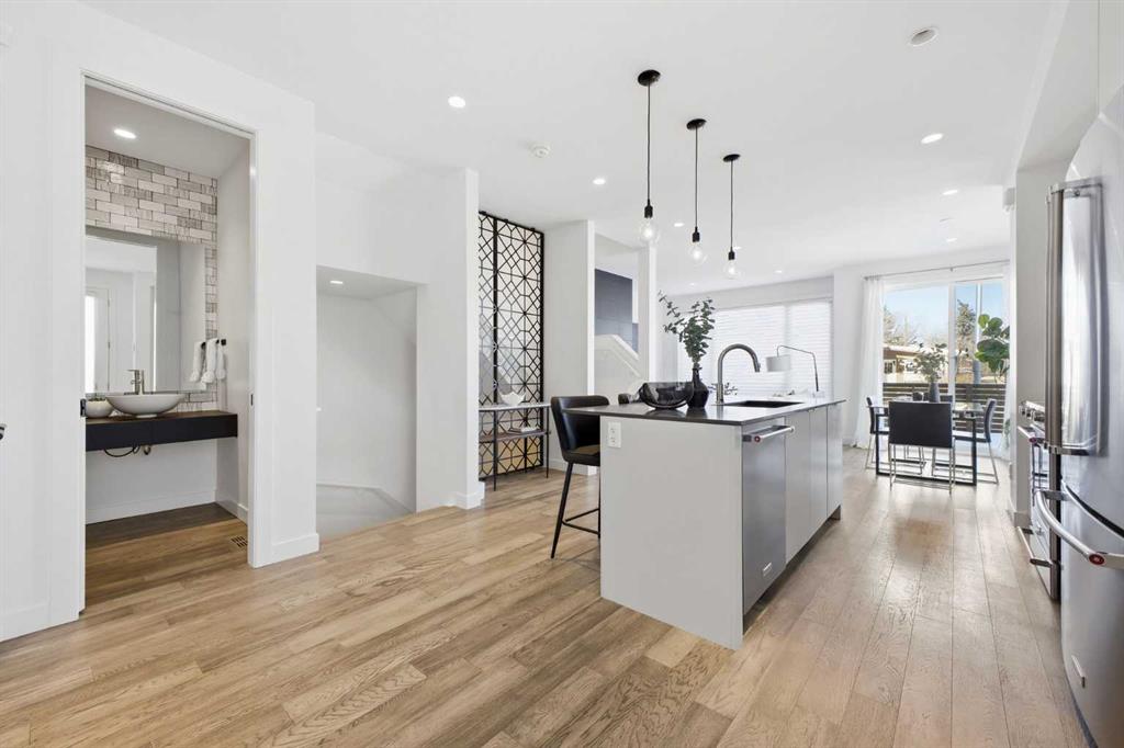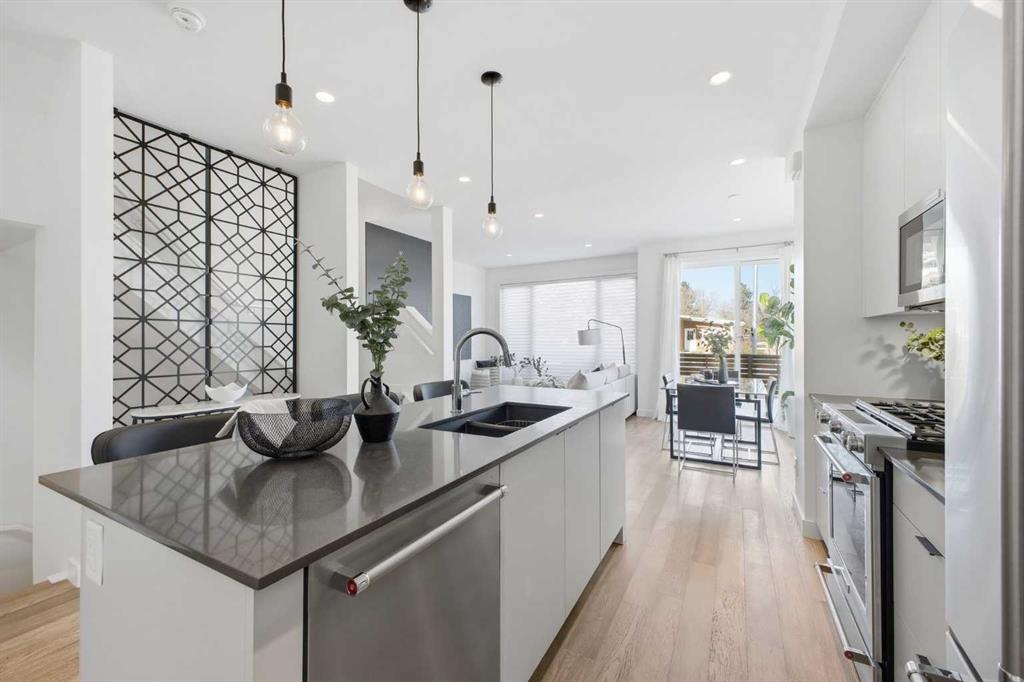 OPEN HOUSE SATURDAY, MARCH 7TH FROM 12-2 & SUNDAY, MARCH 8TH FROM 1-3!! Welcome to this beautifully designed three storey END UNIT townhome in the heart of Altadore, offering nearly 2,200 sq ft of refined living space enhanced by thoughtful upgrades and custom finishes throughout. The open and airy main level features a bright, contemporary layout anchored by a chef’s kitchen with quartz countertops, a large island with eating bar, abundant cabinetry, and stainless steel appliances. The adjoining dining area opens onto the deck—an ideal setting for hosting family and friends—while the inviting living room with gas fireplace creates a warm, stylish space for everyday living and entertaining. The second level hosts two generously sized bedrooms, a well-appointed 4 piece bath, and convenient laundry. The private primary retreat includes a walk in closet and a secluded 4 piece ensuite with dual sinks and an oversized shower. The third floor loft, complete with a wet bar, offers exceptional flexibility as a media room, home office, studio, or lounge. From here, step out onto the private rooftop patio and enjoy sweeping views—an impressive extension of your living space. The fully finished basement adds even more versatility with a spacious recreation room, a third bedroom, and a full bathroom—perfect for guests or additional family needs. Outside, a large front patio provides another inviting spot to relax or entertain. Additional highlights include central air conditioning for year round comfort, heated bathroom floors throughout, and the convenience of a single detached garage. Set within one of Calgary’s most desirable inner city communities, this home is steps from parks, schools, shopping, and the vibrant amenities of Marda Loop, with quick access to downtown. This Altadore townhome blends modern design, custom craftsmanship, and urban convenience—an exceptional opportunity in a sought after location.