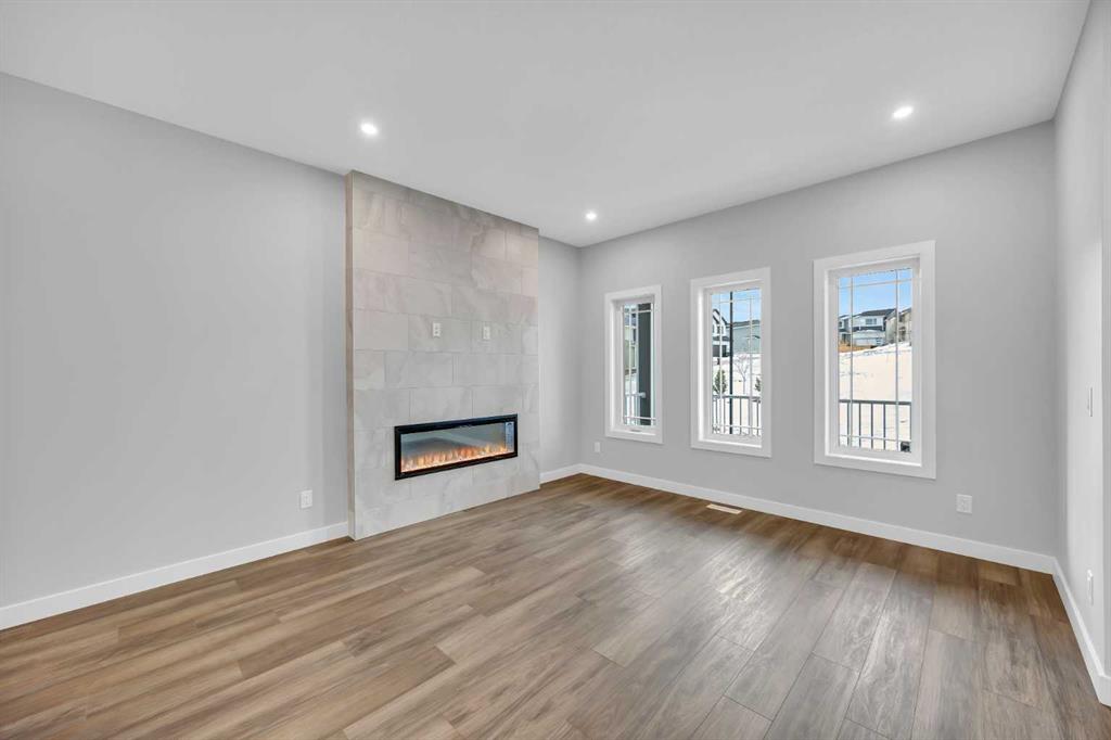 Welcome to the Newport III by Broadview Homes, a brand new 1,680 sq ft home in Vermilion Hill, uniquely positioned fronting directly onto park space. This rare location offers immediate access to green space in one of Southwest Calgary’s most nature focused new communities. Featuring 3 bedrooms, 2.5 bathrooms, a central upper loft, a separate side entrance, detached double garage, rear deck, and an oversized concrete patio, this home delivers thoughtful design and everyday functionality in an exceptional setting. The main floor is designed around a bright open concept layout that supports both daily living and entertaining. At the rear of the home, the kitchen features a central island and a spacious pantry, providing excellent storage and workspace while maintaining clear sightlines to the dining area and great room. The great room is anchored by an electric fireplace with floor to ceiling tile detail, creating a striking focal point within the living space. Large windows allow natural light to fill the home while the rear layout connects seamlessly to the outdoor deck and patio area. Upstairs, the primary suite offers a walk in closet and a private ensuite with dual vanities and a fully tiled walk in shower. Two additional bedrooms, a full 4 piece bathroom, and a centrally located loft provide flexible living space that can function as a second lounge, workspace, or family room. The basement includes rough ins for future development and benefits from the separate side entrance, offering flexibility to expand the living space over time. Located in Vermilion Hill, residents enjoy convenient access to nearby pathways, parks, and natural areas including Fish Creek Park, the Glenmore Reservoir, and Weaselhead Flats. With quick access to the Tsuut’ina Trail and the growing southwest amenities corridor, Vermilion Hill offers a unique balance of outdoor lifestyle and city convenience.