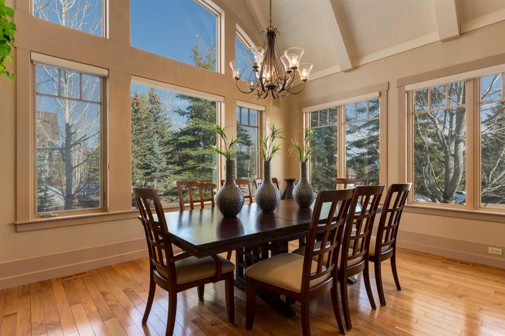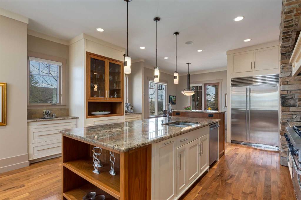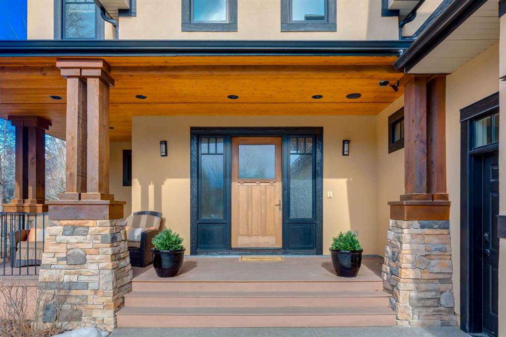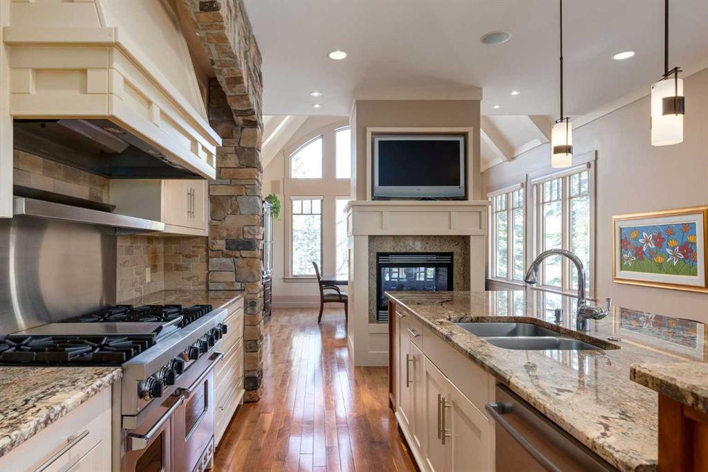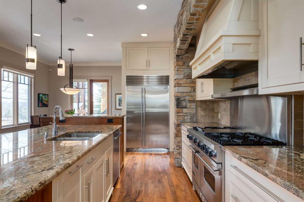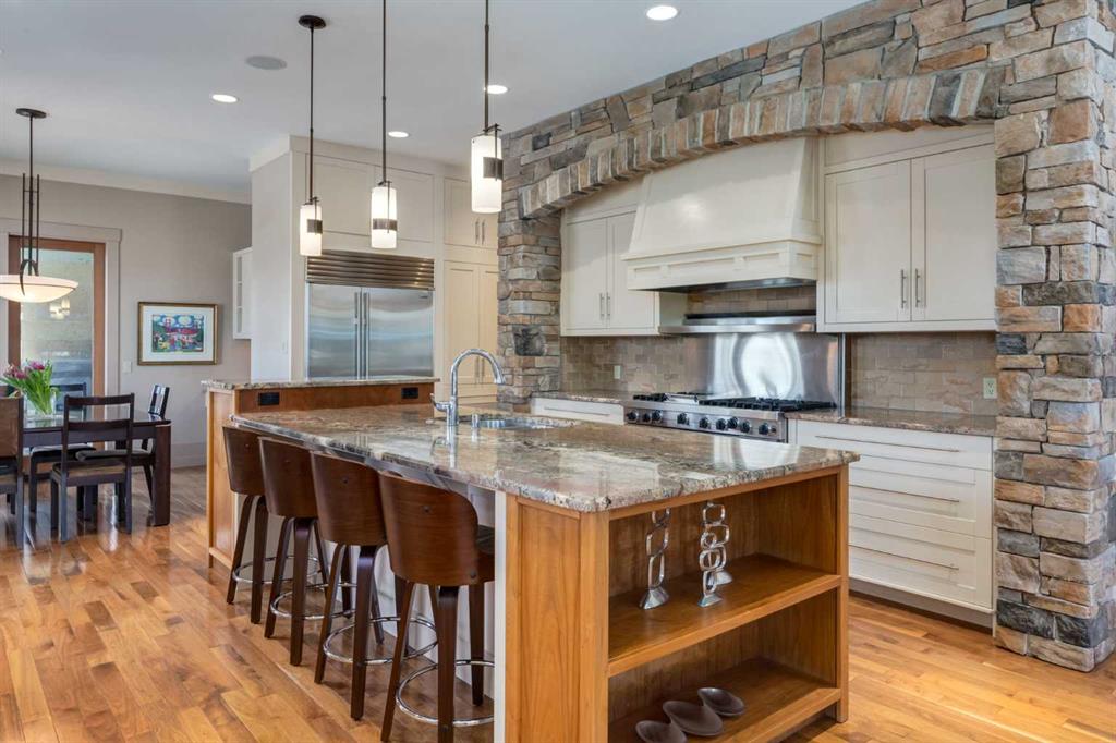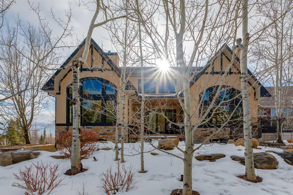 Welcome to luxury living in the prestigious community of Elbow Valley—an award-winning neighborhood just minutes from the city. Surrounded by forests, rivers, and lakes, this custom-built two-story home offers an exceptional lifestyle with a rare four-car heated garage offering over 5690 square feet of living area. As you arrive, the sense of privacy and natural beauty immediately sets the tone. As you enter the home there is a spacious foyer with built-in cabinetry. Just off the entrance is a private powder room and an impressive living room featuring soaring 20-foot vaulted ceilings, abundant natural light, built-in cabinetry, and a cozy wood-burning fireplace. The main floor also showcases an elegant formal dining room with vaulted ceilings highlighted by a two-way fireplace that connects seamlessly to the Italian-inspired chef’s kitchen, complete with high-end appliances, a large island, and stunning marble countertops. Adjacent to the kitchen is a bright breakfast nook with access to a barbecue patio and a secondary entrance to the home. The large mudroom has a second half bathroom leading to the garage which features storage cabinet, built in bike racks, and a dog washing station. Step outside to enjoy the beautifully treed and private backyard featuring a covered deck, fire pit area, and space for a trampoline—perfect for family gatherings and outdoor relaxation.