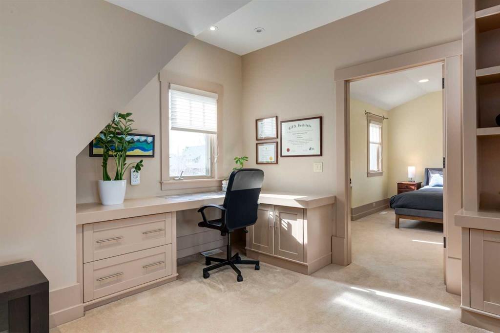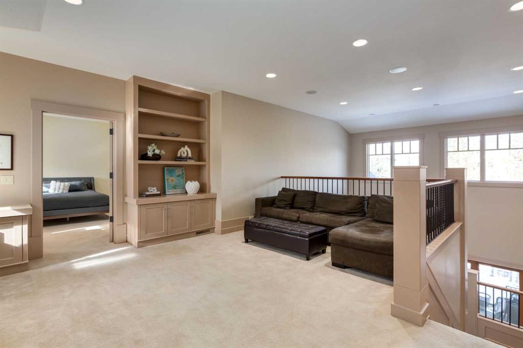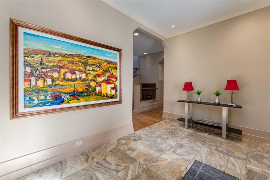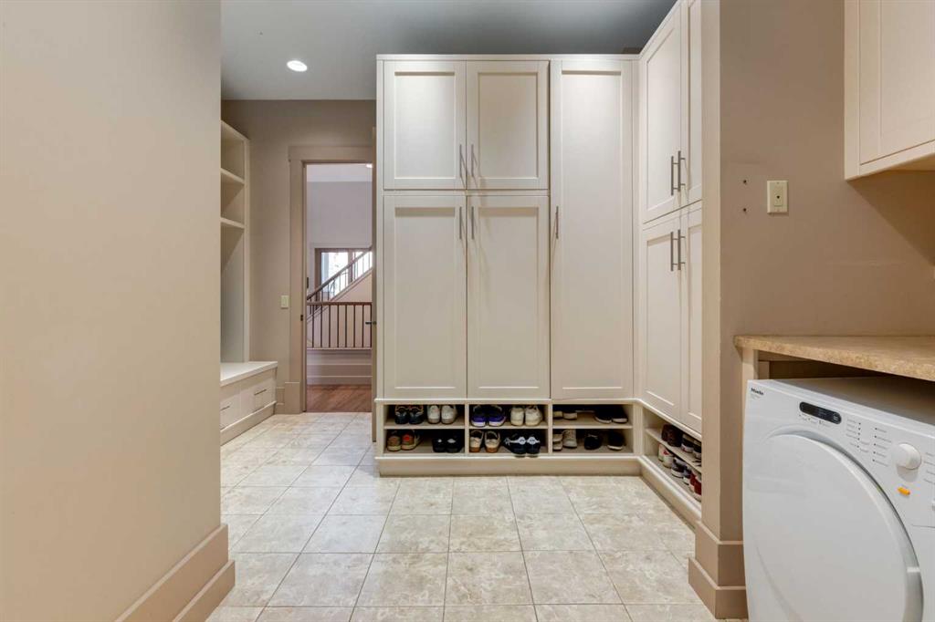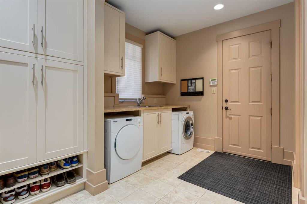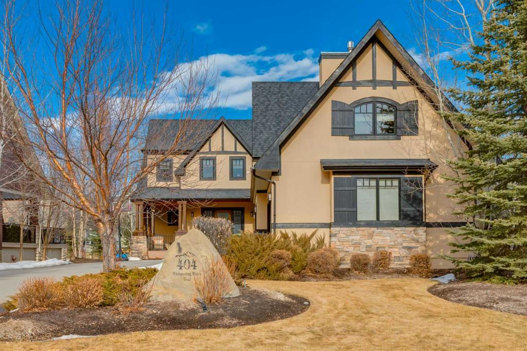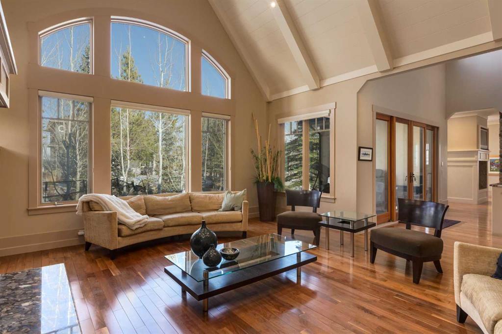 Welcome to luxury living in the prestigious community of Elbow Valley—an award-winning neighborhood just minutes from the city. Surrounded by forests, rivers, and lakes, this custom-built two-story home offers an exceptional lifestyle with a rare four-car heated garage offering over 5690 square feet of living area. As you arrive, the sense of privacy and natural beauty immediately sets the tone. As you enter the home there is a spacious foyer with built-in cabinetry. Just off the entrance is a private powder room and an impressive living room featuring soaring 20-foot vaulted ceilings, abundant natural light, built-in cabinetry, and a cozy wood-burning fireplace. The main floor also showcases an elegant formal dining room with vaulted ceilings highlighted by a two-way fireplace that connects seamlessly to the Italian-inspired chef’s kitchen, complete with high-end appliances, a large island, and stunning marble countertops. Adjacent to the kitchen is a bright breakfast nook with access to a barbecue patio and a secondary entrance to the home. The large mudroom has a second half bathroom leading to the garage which features storage cabinet, built in bike racks, and a dog washing station. Step outside to enjoy the beautifully treed and private backyard featuring a covered deck, fire pit area, and space for a trampoline—perfect for family gatherings and outdoor relaxation.