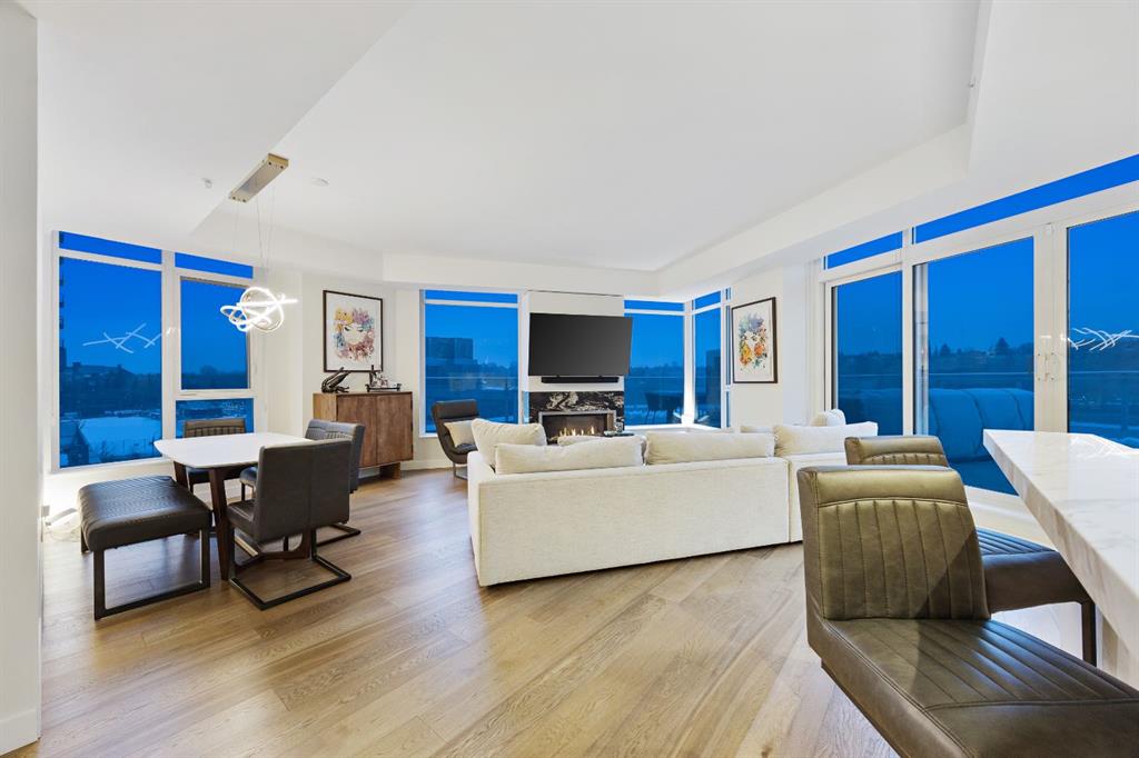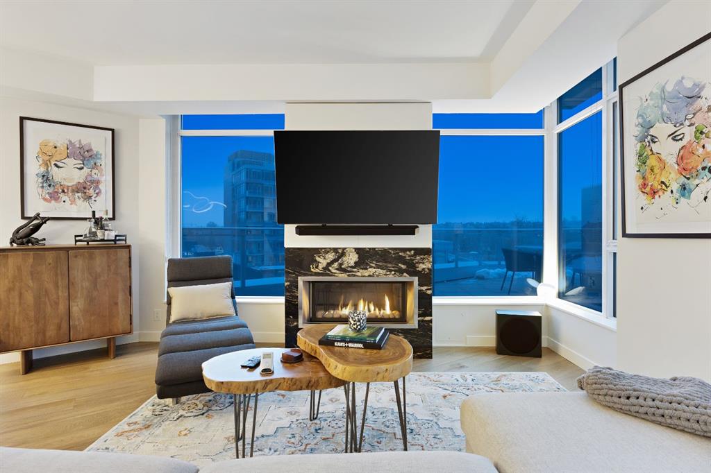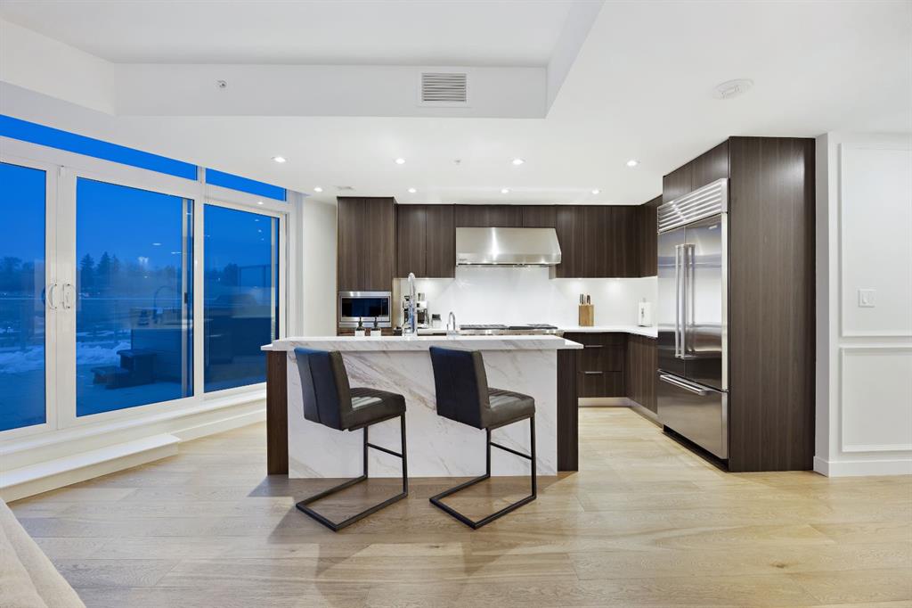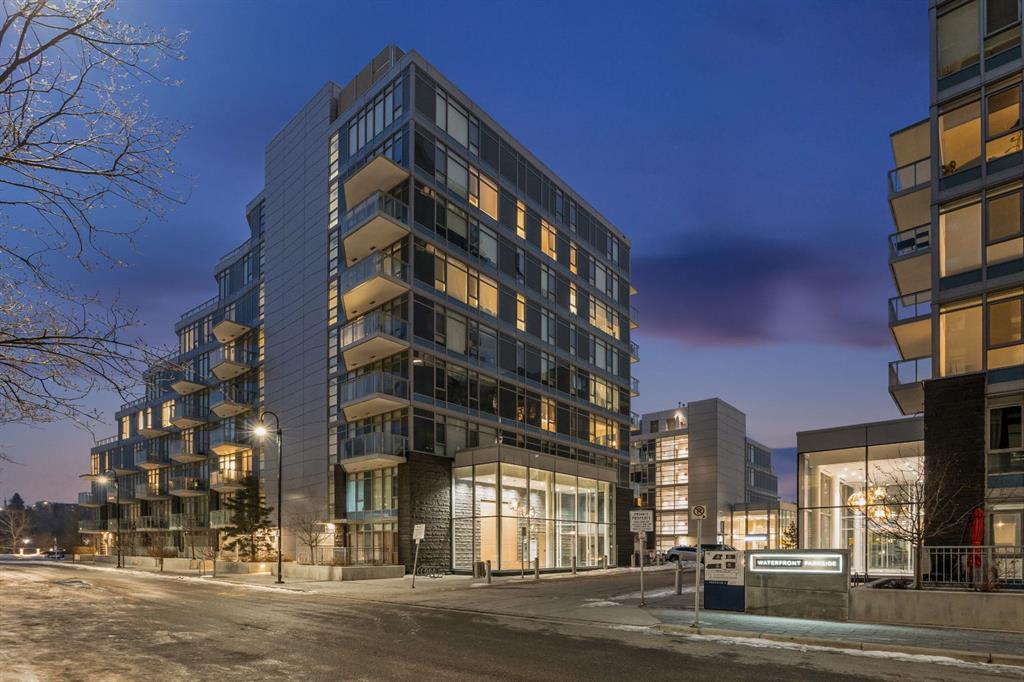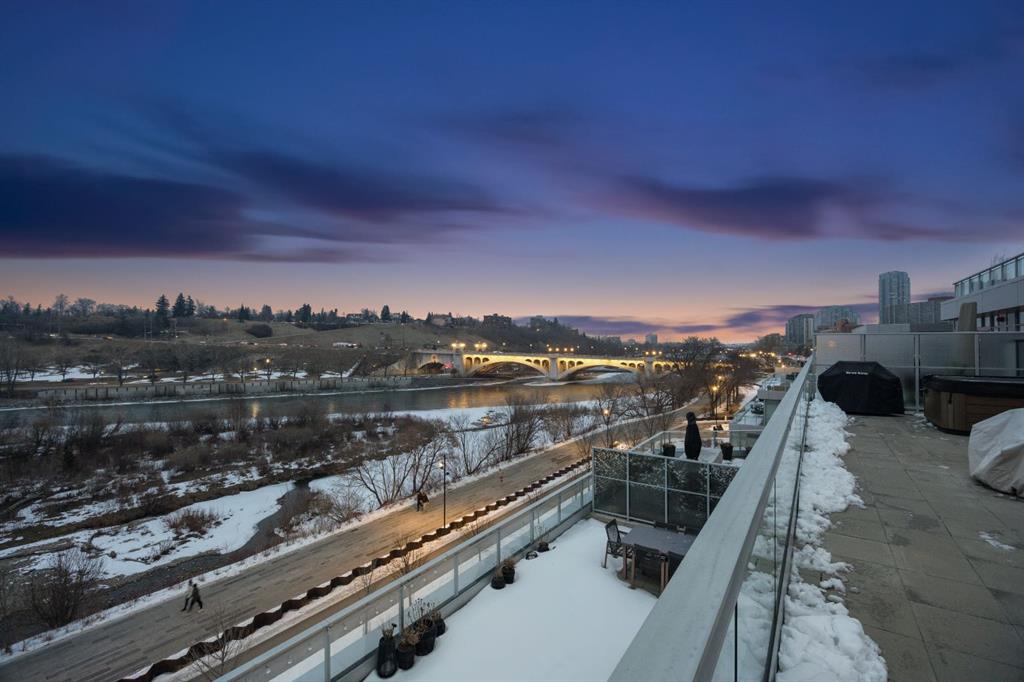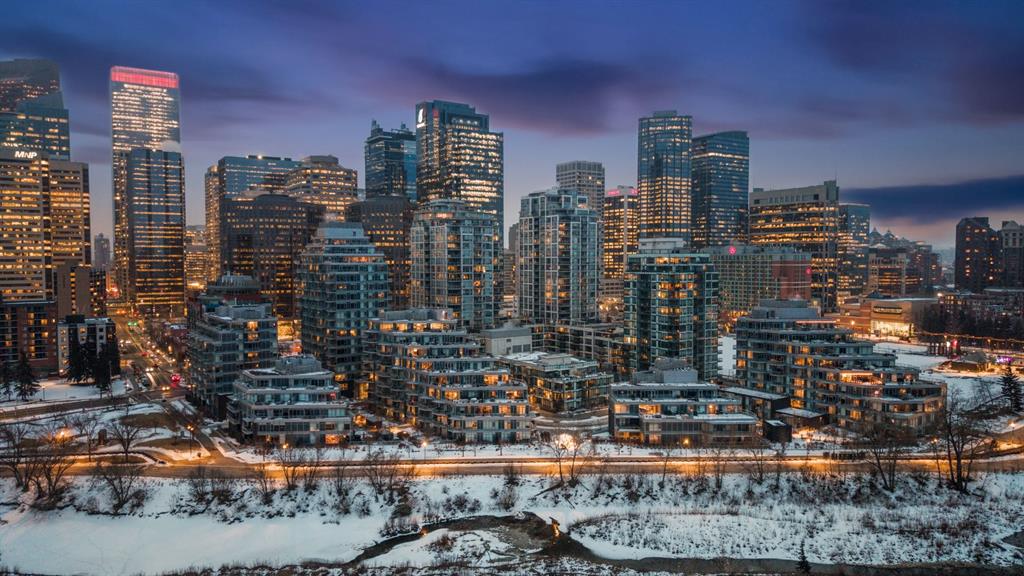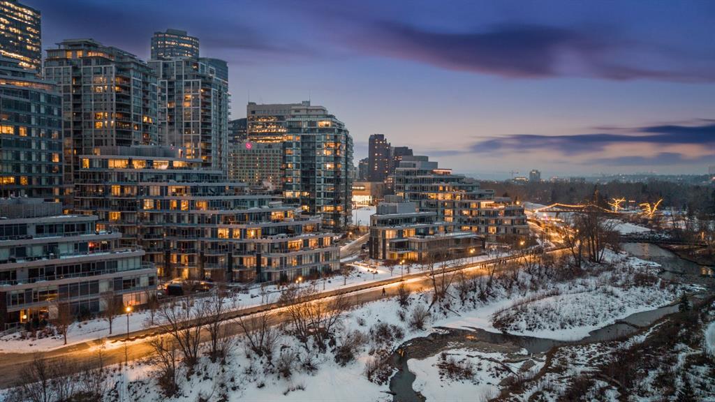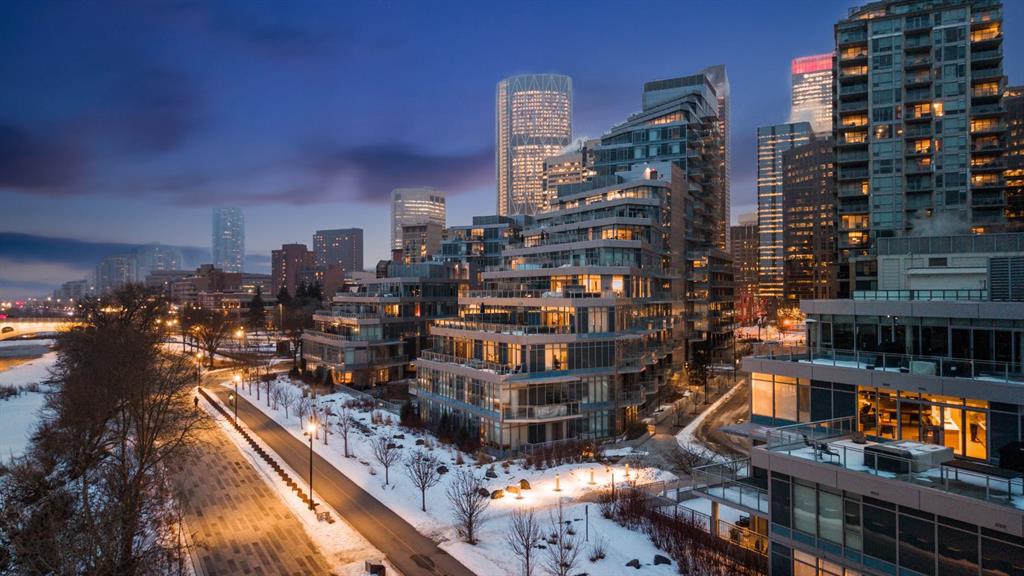 Rare opportunity to own an extensively upgraded executive residence in Parkside at Waterfront, ideally positioned along the scenic Bow River and overlooking Prince's Island Park. Offering over 1,300 square feet of refined living space, this beautifully upgraded suite features an exceptional 731 square feet wraparound patio complete with a hot tub and built-in gas fireplace, perfect for enjoying riverfront views in one of Calgary’s most picturesque settings. A spacious foyer leads to a striking hallway with coffered wall detailing and feature art lighting. The open concept living and dining areas are anchored by a gas fireplace and surrounded by expansive windows that flood the home with natural light. The upgraded chef’s kitchen showcases quartz counters, a large island, Sub-Zero refrigerator and wine fridge, instant hot water, and a 6-burner Wolf gas range with double ovens and a 1200 CFM professional hood fan. The spacious primary retreat offers custom closet shelving, sconces, automated Hunter Douglas blinds with blackout feature, and a luxurious ensuite with dual sinks, soaker tub, and separate shower. A generous second bedroom features its own ensuite and custom closet shelving, while a versatile den is ideal for a home office or pantry. A third full bathroom provides added convenience for guests. Additional highlights include two heated underground parking stalls, storage locker and access to the outstanding amenities at Parkside at Waterfront, including a fitness centre, steam room, hot tub, and party room. Enjoy an unbeatable lifestyle on Calgary’s Bow River pathway system with easy walkability to Downtown Calgary, Eau Claire Athletic Club, Kensington Village, and Prince’s Island Park. This is an incredible opportunity to own the only riverfront unit with a private hot tub in the complex.