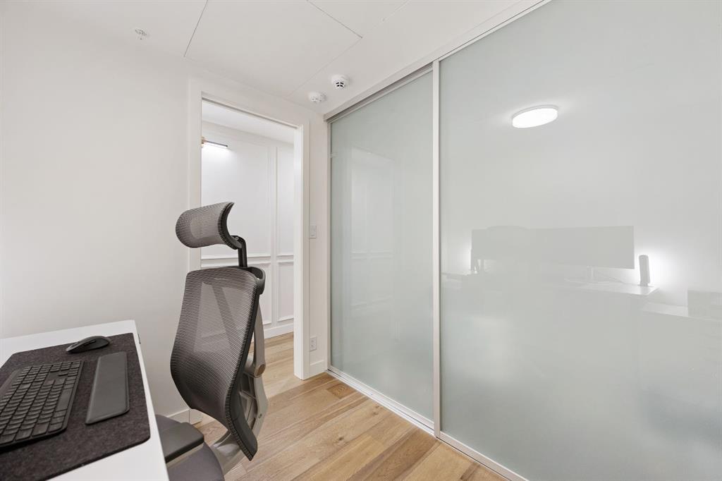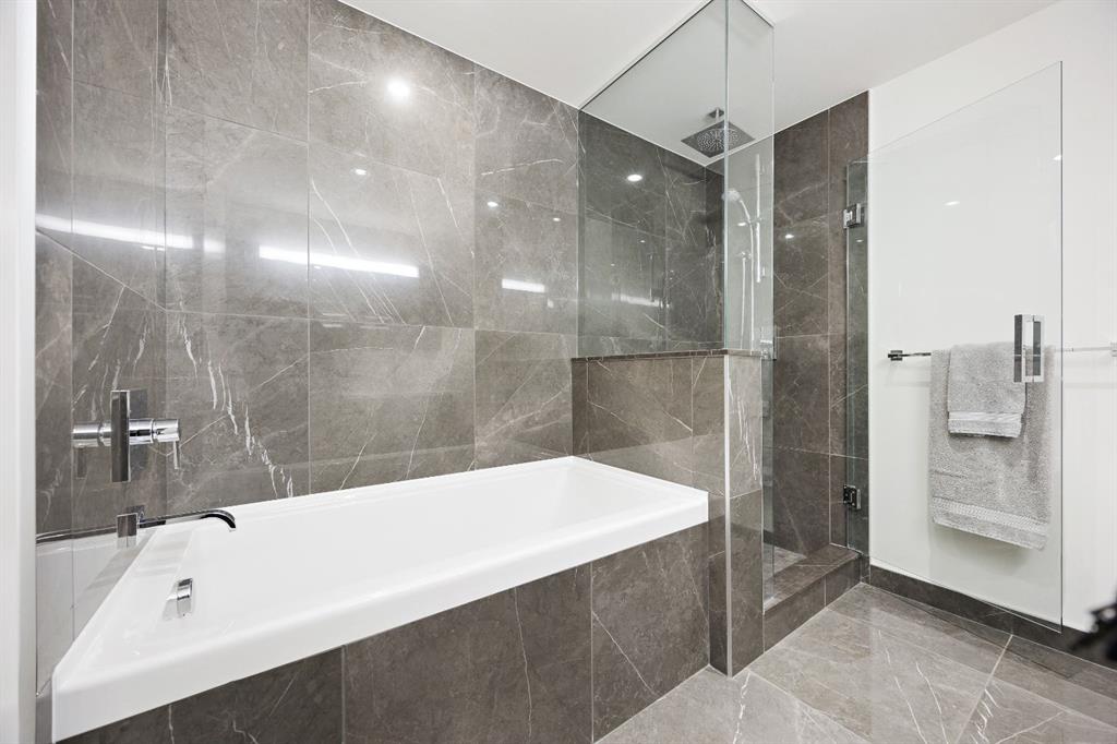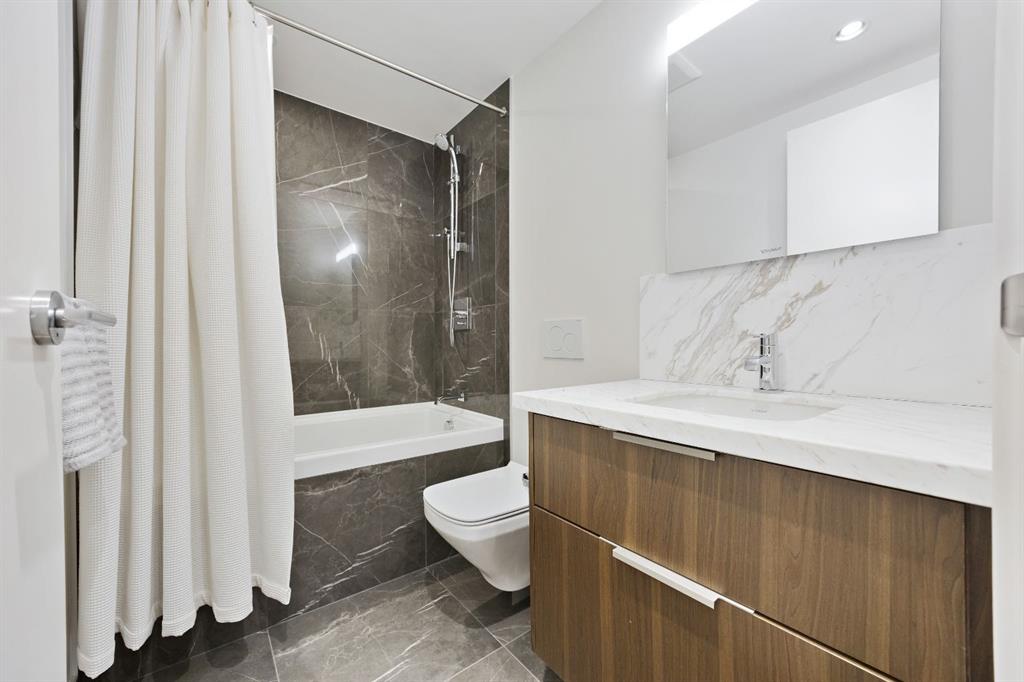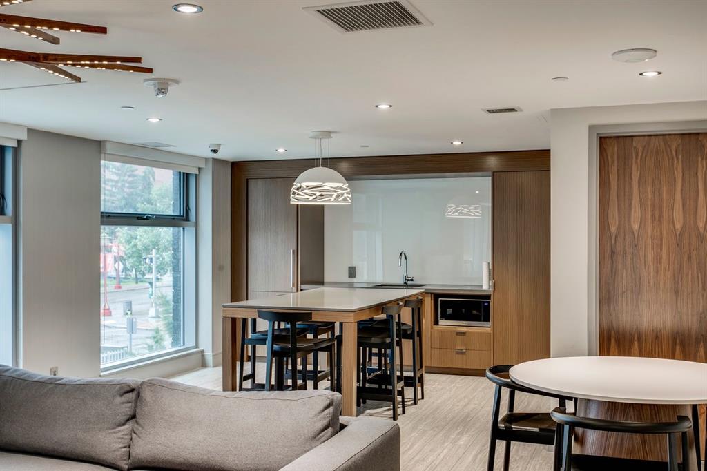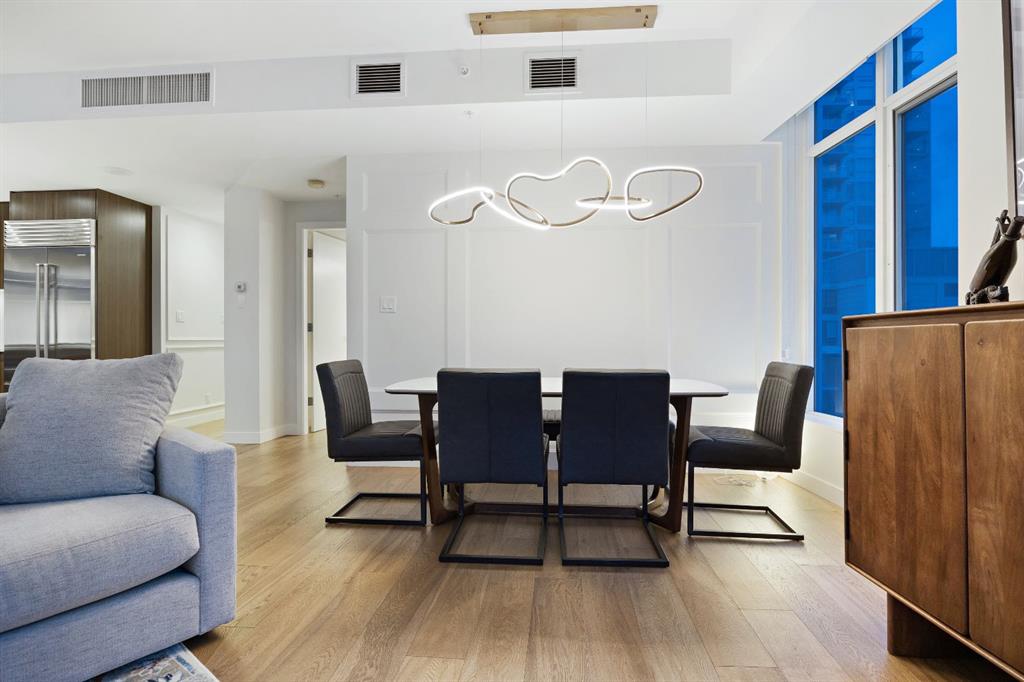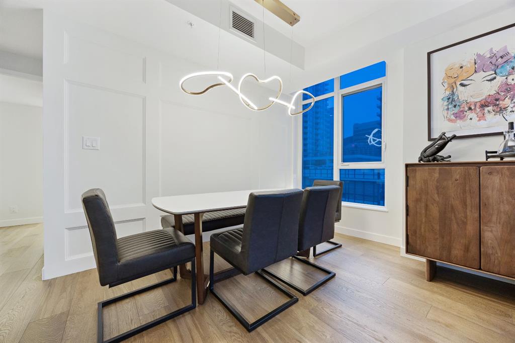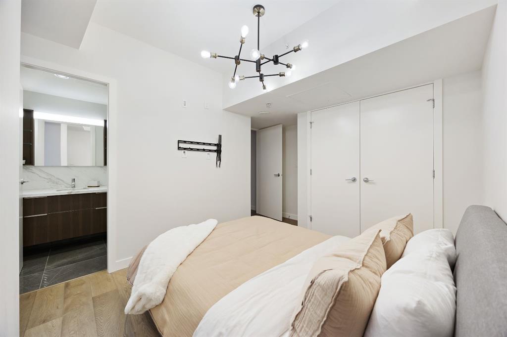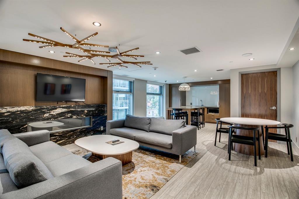 Rare opportunity to own an extensively upgraded executive residence in Parkside at Waterfront, ideally positioned along the scenic Bow River and overlooking Prince's Island Park. Offering over 1,300 square feet of refined living space, this beautifully upgraded suite features an exceptional 731 square feet wraparound patio complete with a hot tub and built-in gas fireplace, perfect for enjoying riverfront views in one of Calgary’s most picturesque settings. A spacious foyer leads to a striking hallway with coffered wall detailing and feature art lighting. The open concept living and dining areas are anchored by a gas fireplace and surrounded by expansive windows that flood the home with natural light. The upgraded chef’s kitchen showcases quartz counters, a large island, Sub-Zero refrigerator and wine fridge, instant hot water, and a 6-burner Wolf gas range with double ovens and a 1200 CFM professional hood fan. The spacious primary retreat offers custom closet shelving, sconces, automated Hunter Douglas blinds with blackout feature, and a luxurious ensuite with dual sinks, soaker tub, and separate shower. A generous second bedroom features its own ensuite and custom closet shelving, while a versatile den is ideal for a home office or pantry. A third full bathroom provides added convenience for guests. Additional highlights include two heated underground parking stalls, storage locker and access to the outstanding amenities at Parkside at Waterfront, including a fitness centre, steam room, hot tub, and party room. Enjoy an unbeatable lifestyle on Calgary’s Bow River pathway system with easy walkability to Downtown Calgary, Eau Claire Athletic Club, Kensington Village, and Prince’s Island Park. This is an incredible opportunity to own the only riverfront unit with a private hot tub in the complex.