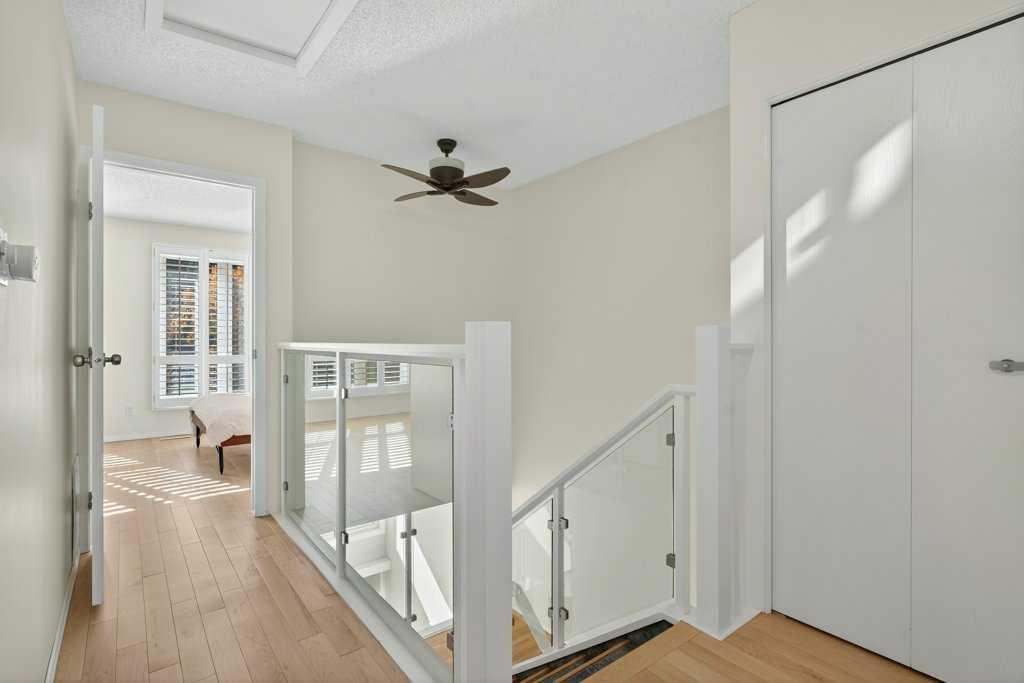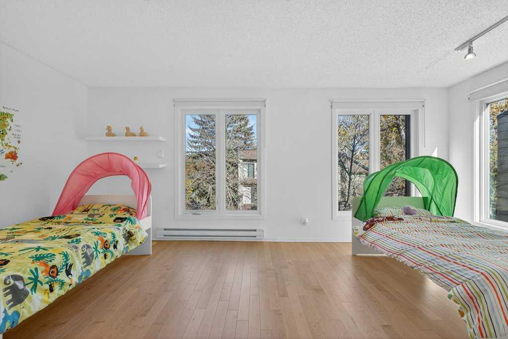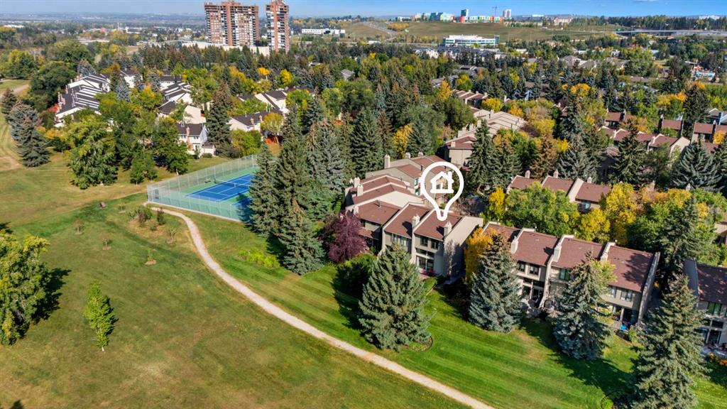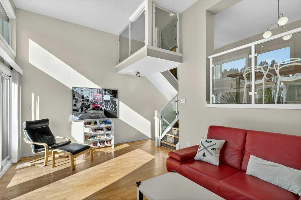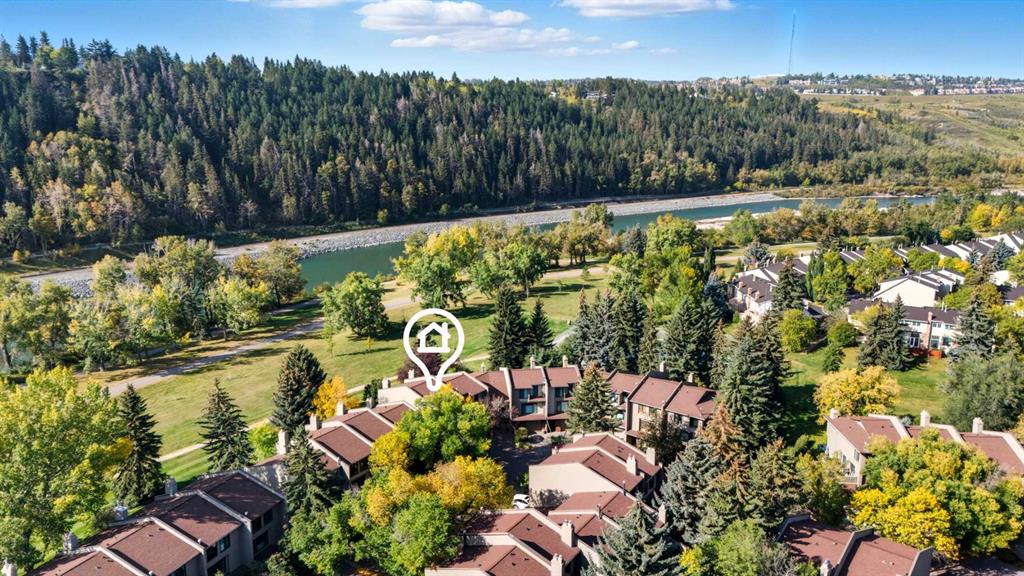 Experience inner-city living in harmony with Calgary's natural beauty, right in your backyard with this special riverside residence in Point McKay I. The Bow River, walking and biking pathways, and greenspace are easily admired from the sweeping rear windows in this end unit townhome, from the recently enlarged composite deck (over 200 sqft), or by immersing yourself fully and stepping right into nature. This condo community is beautifully maintained throughout, featuring hanging flower baskets in the summer, mature trees, and a strong sense of pride of ownership, adding to the peaceful atmosphere. Thoughtfully renovated, it features hardwood flooring throughout, a functional kitchen with stainless steel appliances, and plenty of room for dining. The main level living room with vaulted ceilings offers two gorgeous focal points – out the large (newer) windows framing the expansive nature greenspace beside the Bow River, or more inward toward the sleek, modern gas fireplace. Moving up through the home, the upgraded glass panel railings underscore light and openness at every turn. On the second level, you'll find the accessible and well laid out dining room, updated kitchen with a generous island and ample cabinets, a large pantry that also houses the laundry room, plus a half bath. On the top level, there are two generously sized bedrooms and two full bathrooms. The primary bedroom (with ensuite bath) has all the twinkling Bow River views you could want. Another full bathroom and a huge second bedroom complete this level. The second bedroom could easily be divided to create a third bedroom while still offering ample space and closet storage. Because this townhome is an end unit, three large windows fill this bedroom with natural light. The lower two levels include a welcoming foyer, access to the single car garage (with an electric heater and workbench area), a finished rec room for games, exercise or hobby, storage under the stairs, plus a utility room with additional storage space. A second car can be parked on the full-length driveway, but the complex also has quite a few guest parking areas. Another condo amenity - condo fee includes cable and internet. Not too far away (but not too close!), you'll find the well maintained Point McKay tennis courts just a little west. Have it all and live your extraordinary life in this contemporary gem, nestled in the tranquil backdrop of The Bow.