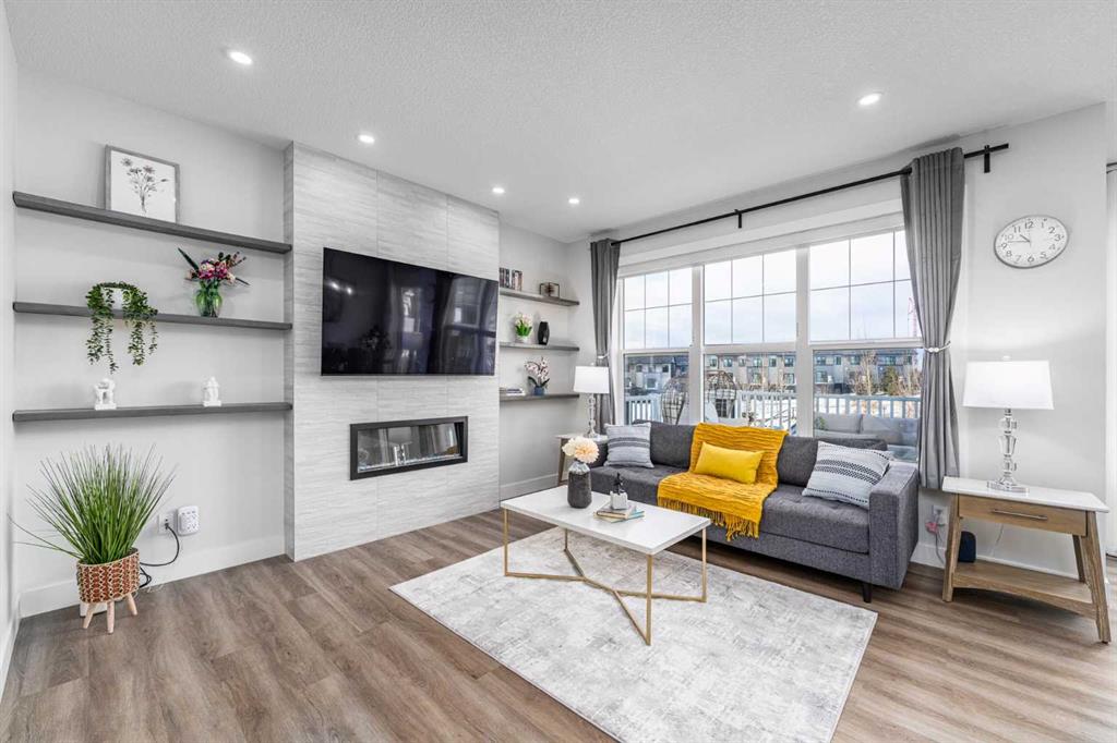 The living area is filled with natural light and centered around a sleek electric fireplace. The spacious dining room opens onto a large balcony overlooking the mountains, green space, pond, and playground — the perfect spot to enjoy your morning coffee while keeping an eye on the kids playing nearby.