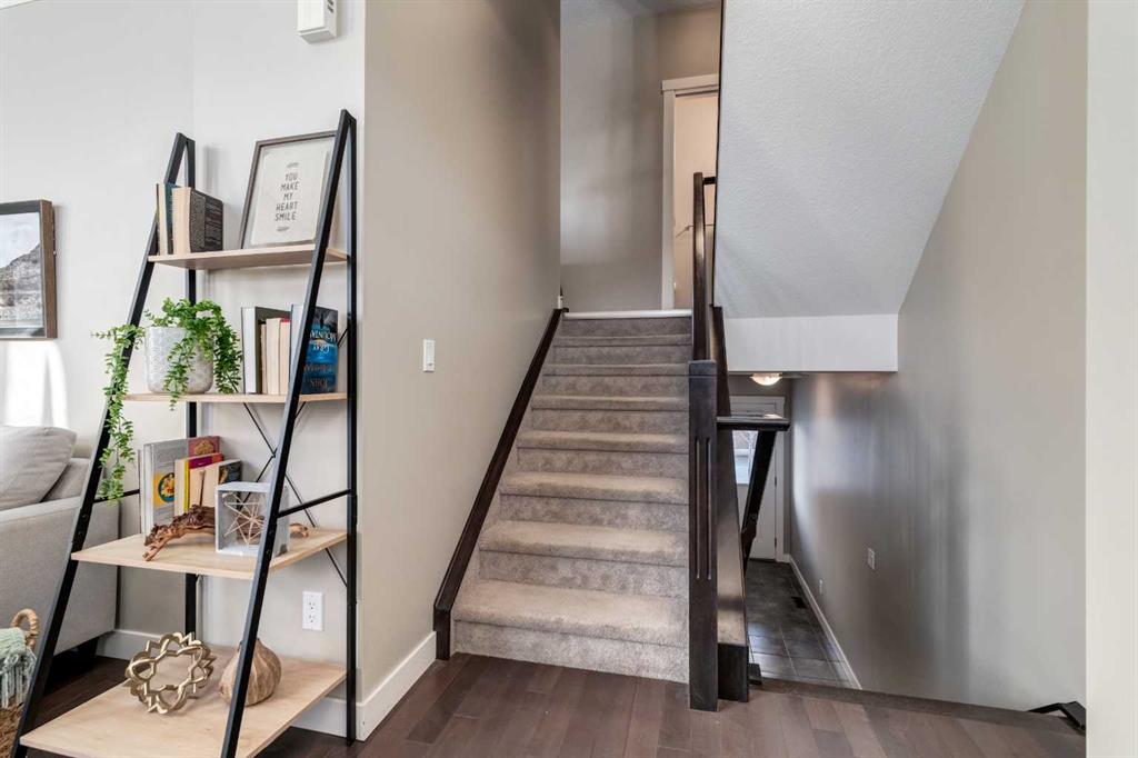 The main level features a stylish, open entertaining space with tall ceilings (14 ft), flooded with natural light from large windows as hardwood flooring finishes the space. Moving up a level, you're greeted with a spacious kitchen along with convenient main-floor laundry and a two-piece powder room. Step out onto the east-facing balcony and enjoy beautiful morning sunshine—perfect for coffee or quiet starts to your day.