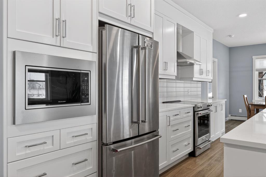 The kitchen is thoughtfully appointed with upgraded cabinetry, quartz countertops, designer tile, stainless appliances, and a spacious central island, offering both functionality and style.