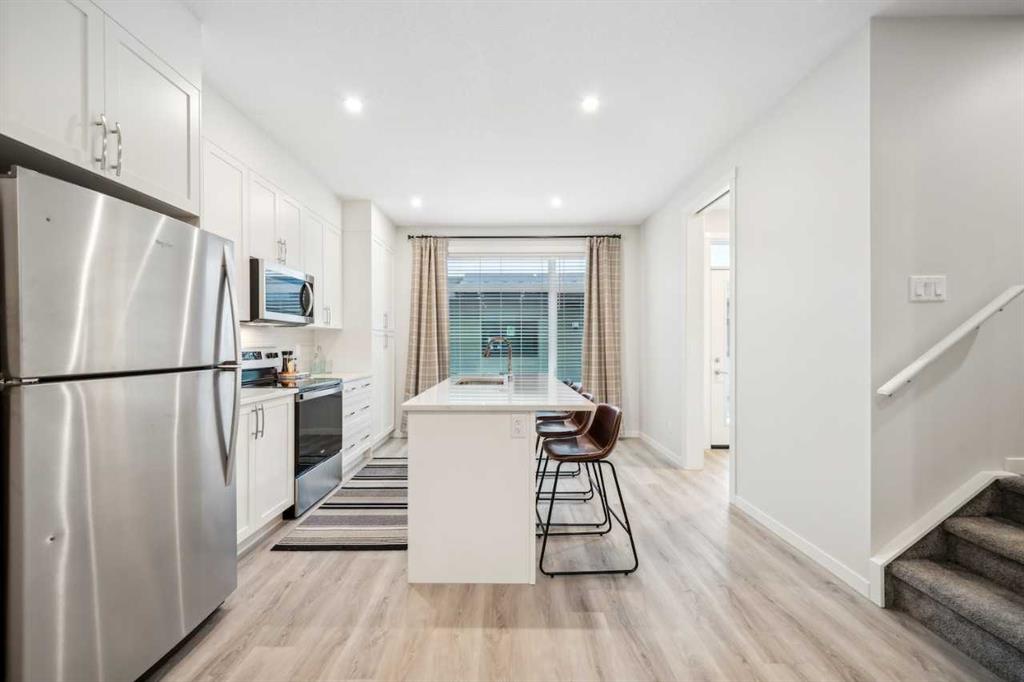 Welcome to ZEN Greystone, a vibrant and walkable community in the heart of Cochrane. This beautifully designed 3-bedroom, 2.5-bath townhome offers 1,434 sq. ft. of modern living space. The open-concept main floor features a spacious kitchen with stainless steel appliances, quartz countertops, and a large island that flows into the dining and living areas — perfect for entertaining. Upstairs, the primary bedroom includes a walk-in closet and an ensuite with a double vanity, while two additional bedrooms, a full bath, and upper-floor laundry provide everyday convenience. Additional highlights include a fenced backyard, double detached garage, and potential basement development. Enjoy a walkable lifestyle close to pathways, parks, tennis courts, Cochrane Pickleball Club, SLS Centre, off-leash dog park, Co-op, Bow RiversEdge Campground, and Downtown Cochrane. Experience the perfect blend of modern living and small-town charm at ZEN Greystone! Photos are representative.