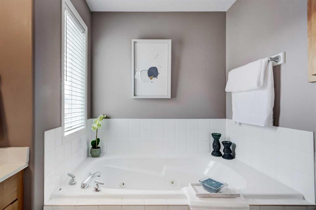 Upstairs you’ll find three generous bedrooms including a relaxing primary retreat with walk-in closet and spa-inspired ensuite featuring a jetted tub, double vanities, and separate shower. The impressive bonus room above the garage showcases vaulted ceilings, a cozy gas fireplace, and sunny southwest-facing windows.