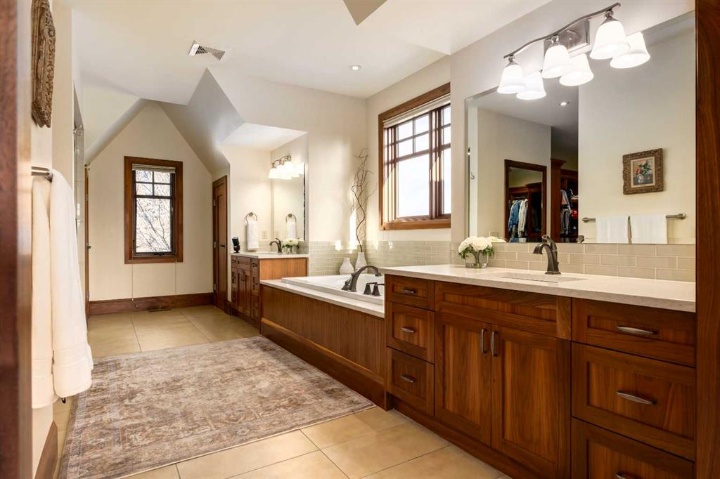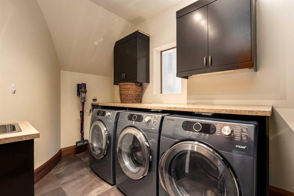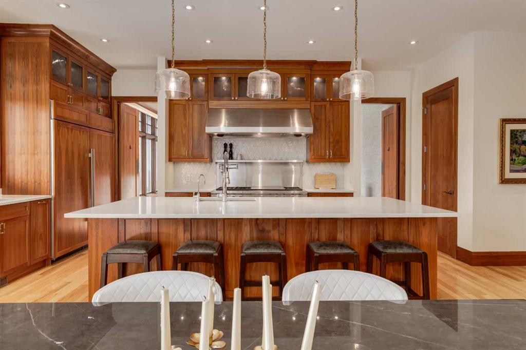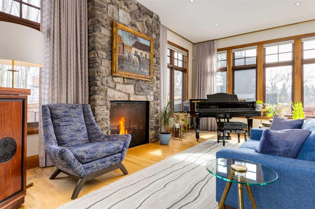 Occupying a rare double lot along Madison Avenue in the prestigious community of Elboya, this castle-inspired estate is defined by its striking stone façade and grand scale. Offering over 7,780 square feet of luxury, with six bedrooms, six full and two half bathrooms, the home is thoughtfully designed for elevated family living and exceptional entertaining. A spacious foyer welcomes you inside, while a private office with walnut built-ins and 21’ ft vaulted ceilings adds warmth and sophistication. At the heart of the home, the recently refreshed chef’s kitchen features new paint, lighting, and countertops, along with double walk-in pantries, an oversized island, dual dishwashers, wine fridge, and premium appliances including a 6-burner Wolf gas range, integrated Sub-Zero refrigerator, and built-in Miele espresso machine. The kitchen flows seamlessly into the informal dining area and expansive living room, where floor-to-ceiling windows showcase the south-facing backyard and provide direct outdoor access. The main floor is completed by a formal dining room with built-ins, a bedroom with walk-in closet and private ensuite, a thoughtfully designed utility room with skylights, sink, in-floor drain and dedicated A/C - ideal for a dog wash - and a stylish powder room. Upstairs, the primary retreat offers 13’ vaulted ceilings, south exposure, a luxurious 5-piece ensuite with steam shower and boutique-style walk-in closet. Two additional bedrooms each have their own ensuites and vaulted ceilings, while a turreted office captures downtown views. A large upper laundry room includes dual washers, dryer, sink, and extensive cabinetry. The recently remodelled lower level is designed for recreation and relaxation, complete with a golf simulator, 6-seater tiered theatre room, wine room, wet bar, and expansive games area. Two additional bedrooms with walk-in closets and private ensuite bathrooms provide ideal accommodations for guests or older children. A wood-panelled elevator seamlessly connects all three levels. Mechanical features include in-floor heating, dual furnaces, multiple boilers, hot water heaters, and new air-conditioning units. Car enthusiasts will appreciate the rare quad subterranean garage with epoxy flooring and snow-melt driveway. The south-facing backyard is built for year-round enjoyment, featuring a screened patio with built-in BBQ/prep space and overhead heater, wood-burning fireplace, seating area, gated dog run, and raised garden. A heated front walkway ensures seamless winter maintenance. Ideally located near picturesque Elbow River pathways and Stanley Park, this exceptional property offers a truly elevated lifestyle in one of Calgary’s most sought-after inner-city communities.