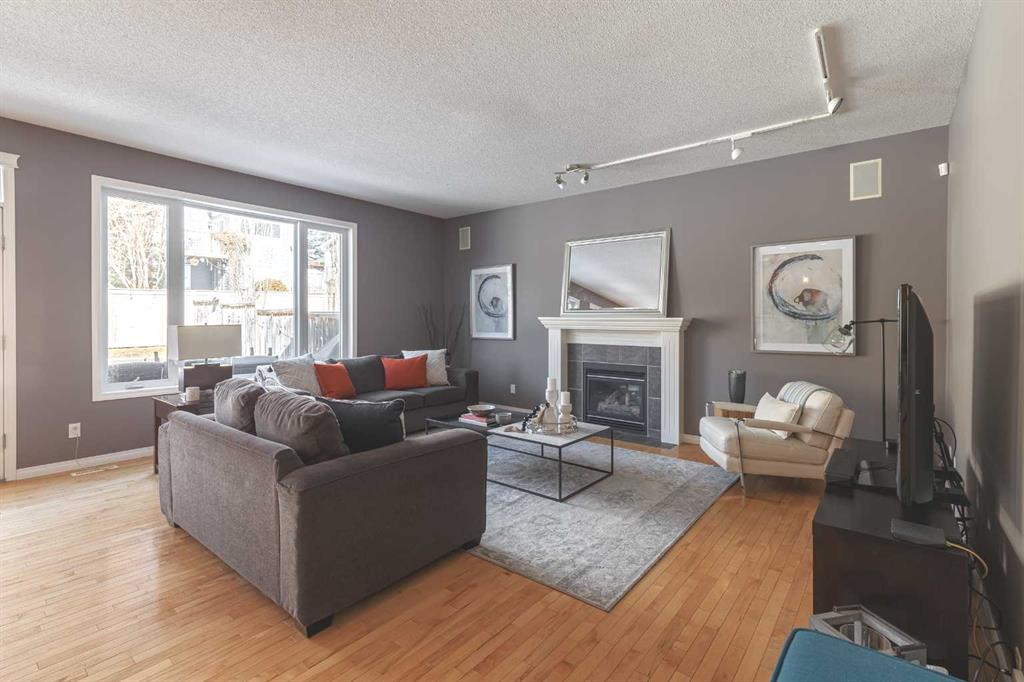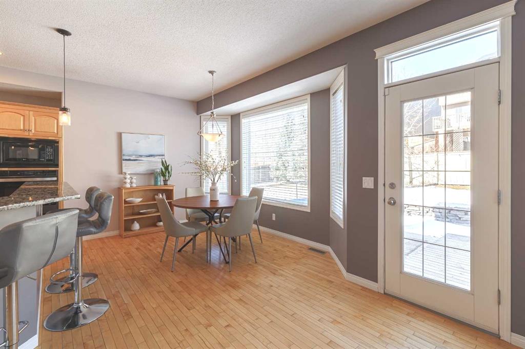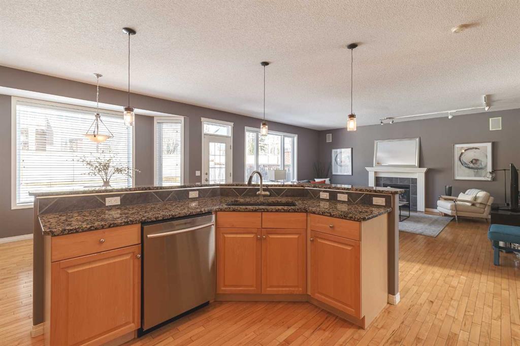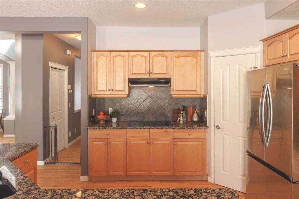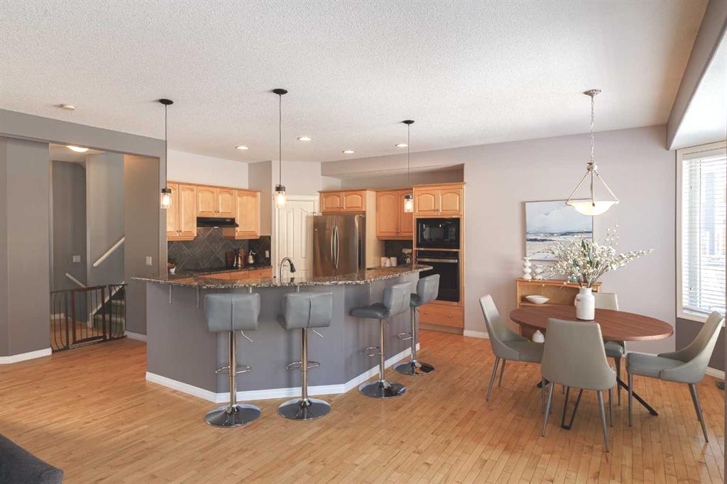 The bright and functional main floor features maple hardwood flooring, 9 ft ceilings, rounded corners, and large windows that fill the home with natural light. The expansive and inviting great room is centered around a cozy gas fireplace, creating a comfortable space for relaxing or gathering with family and friends. The kitchen offers generous counter space, granite countertops, a large eating bar, cooktop, built-in oven and microwave, and a sunny dining area with a charming bay window overlooking the backyard. A new Samsung refrigerator with beverage centre completes the well-equipped kitchen.