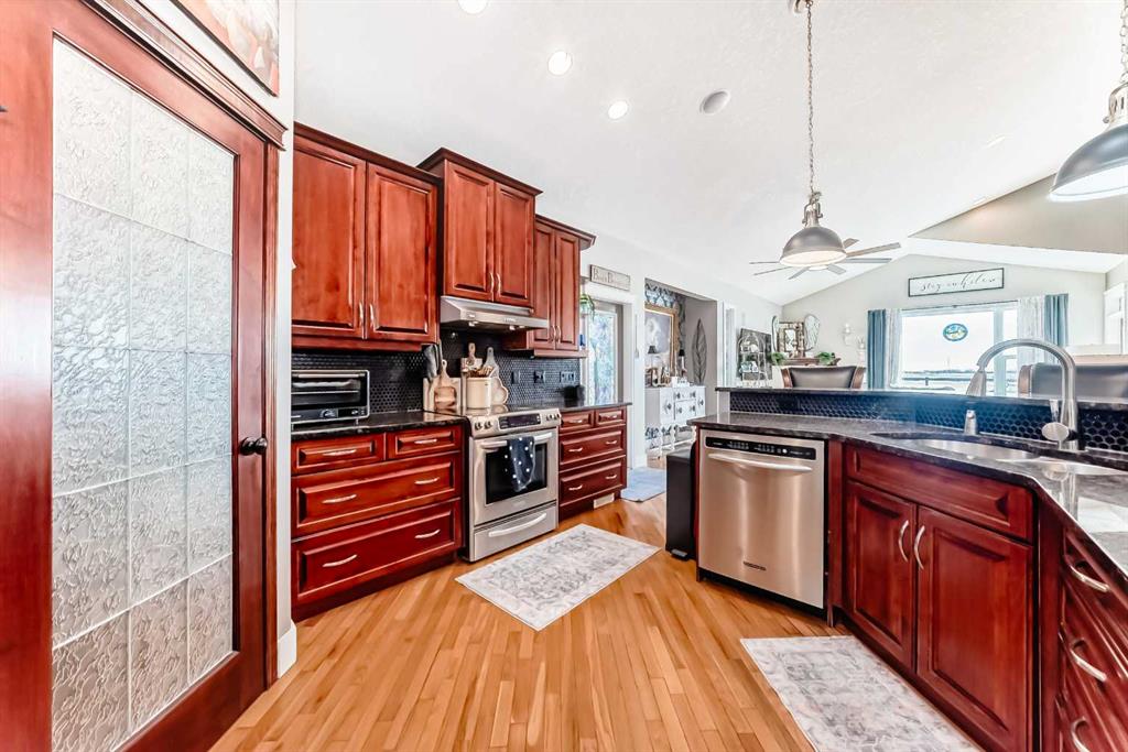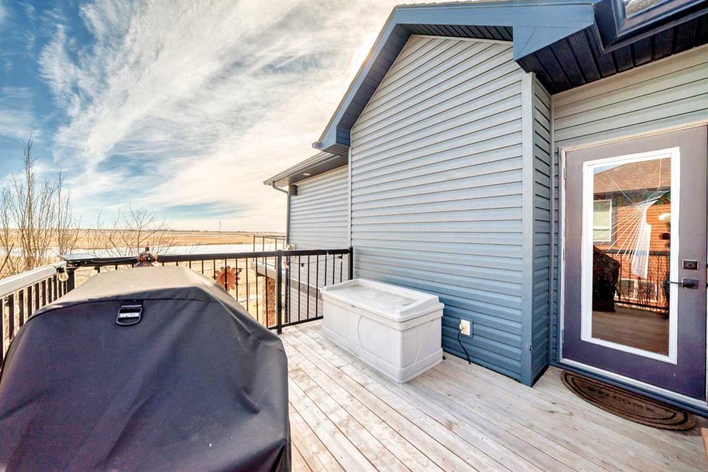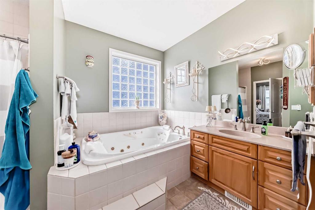 Beautiful 3-bedroom walk-out bungalow in the sought-after Boulder Creek Estates, perfectly positioned on the Par 3 11th fairway with stunning golf course views! Enjoy the spacious, private east-facing deck, complete with gas line hookup - perfect for relaxing while taking in the peaceful surroundings and the occasional golfer passing by. This outstanding open-concept bungalow features a welcoming foyer finished with cork flooring and vaulted ceilings throughout the main level. The kitchen has abundant cabinetry, a large island with an eating bar, granite countertops, and Whirlpool appliances, all opening to the living room with huge windows with a great view of the golf course. A newer deck with access from the kitchen is a great spot for a BBQ or smoker! The main level offers a spacious mudroom/laundry room complete with a sink and a convenient walk-through pantry. The oversized heated double garage features newer epoxy flooring and ample space for a workbench. The primary suite features a walk-in closet with stylish barn doors and a spacious ensuite, complete with a jetted tub and a separate shower. Also on the main level is a 2-piece bathroom and a versatile office/den. Downstairs features two bedrooms, both with walk-in closets, and a spacious 4-piece bathroom. The rec room flows into the family room, complete with a wet bar rough-in, and offers walk-out access to the covered patio and a private yard with a paved patio, sidewalks, and a hot tub rough-in. This exceptional home is wired for sound throughout, with speakers on both levels, both decks, the patio, and even the garage. The utility room also features newer epoxy flooring. Conveniently located close to schools and great restaurants, it offers the feel of living outside the city while still enjoying nearby amenities. This is one you don’t want to miss!