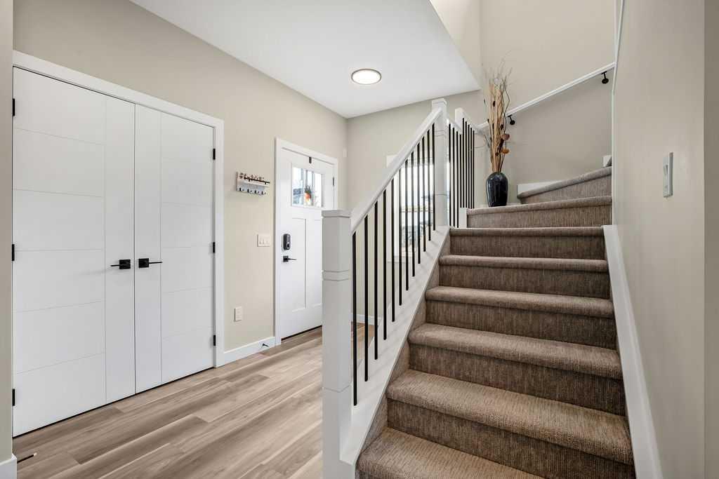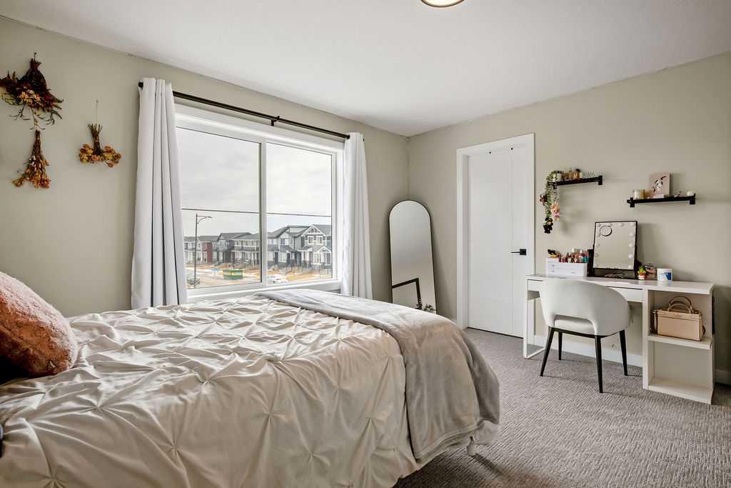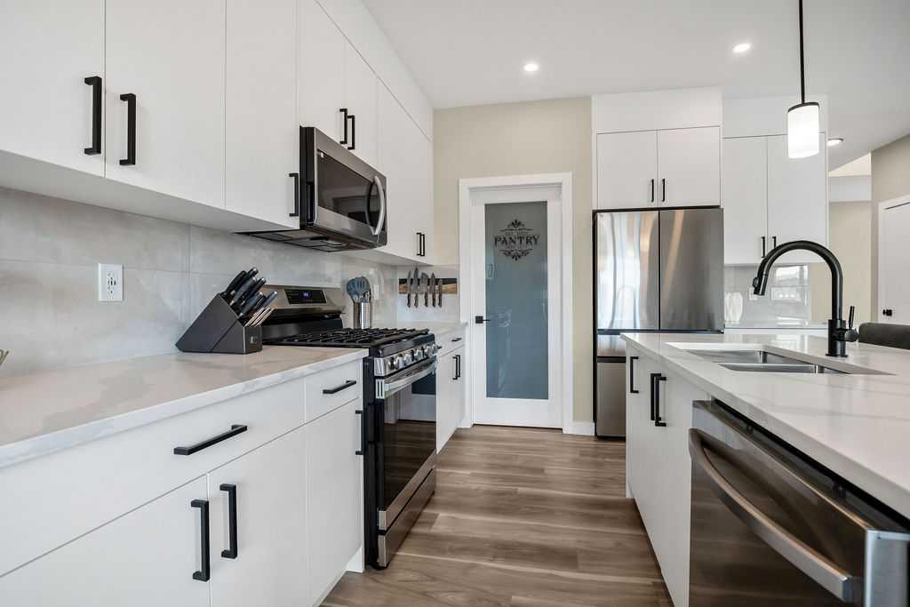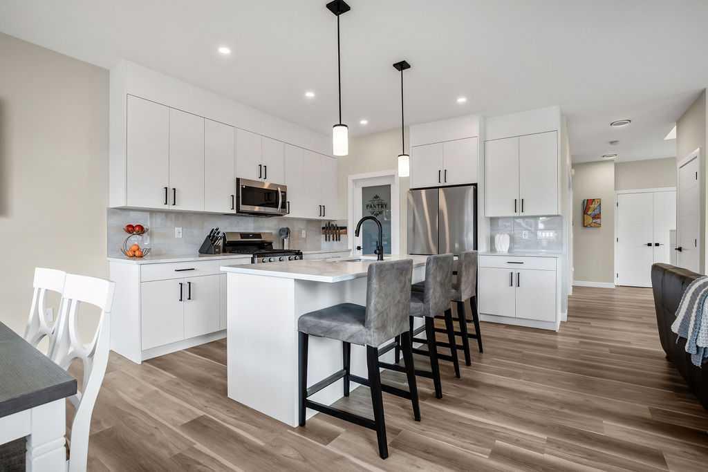 Step inside to a bright, open-concept main floor featuring 9-foot ceilings and a versatile den—ideal for a home office or flex space. The stunning white kitchen is the heart of the home, complete with quartz countertops, premium cabinetry, a walk-through pantry, and a full stainless steel appliance package—perfect for both everyday living and entertaining.