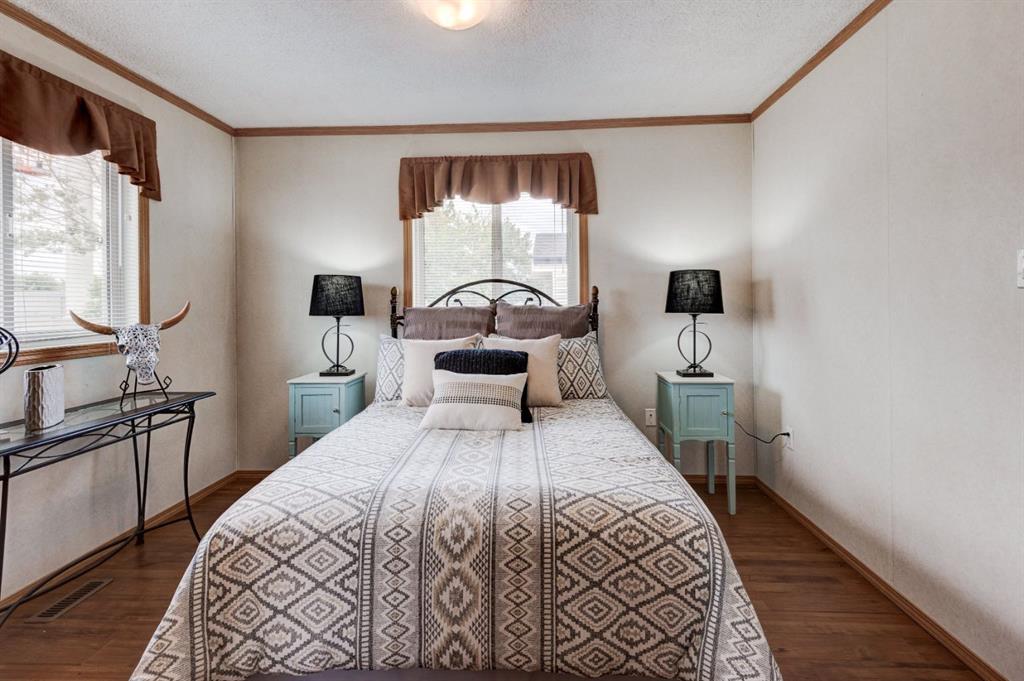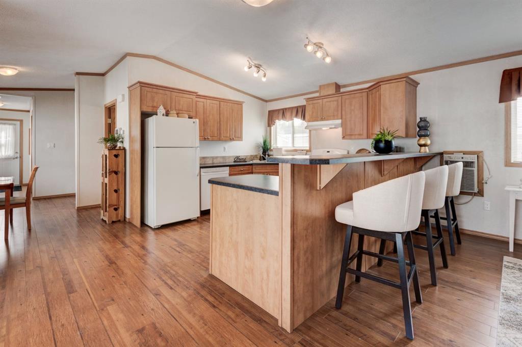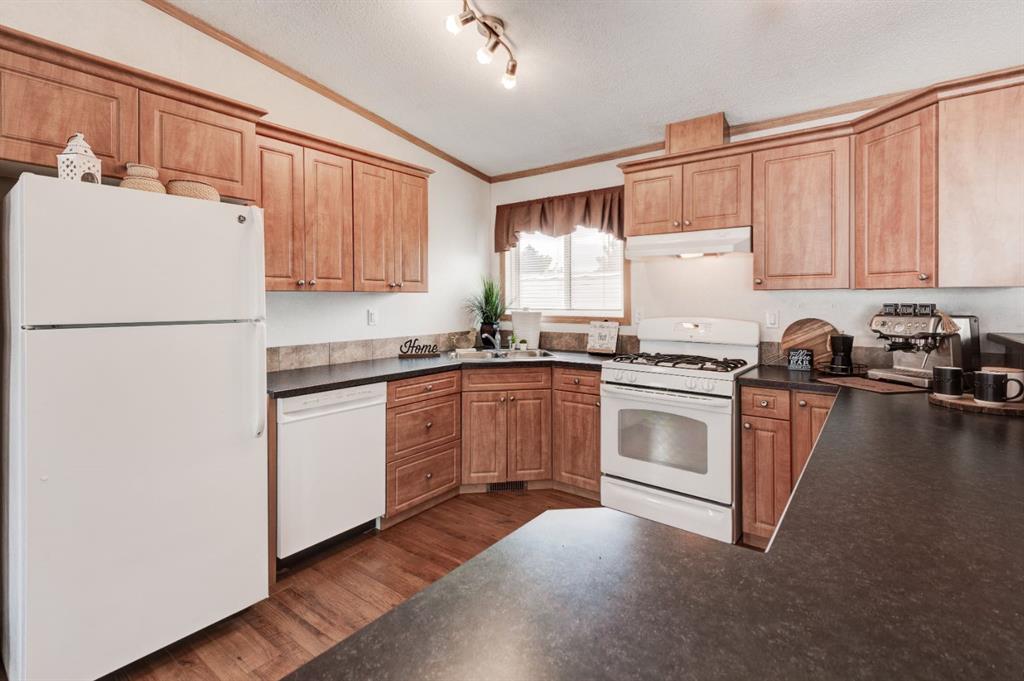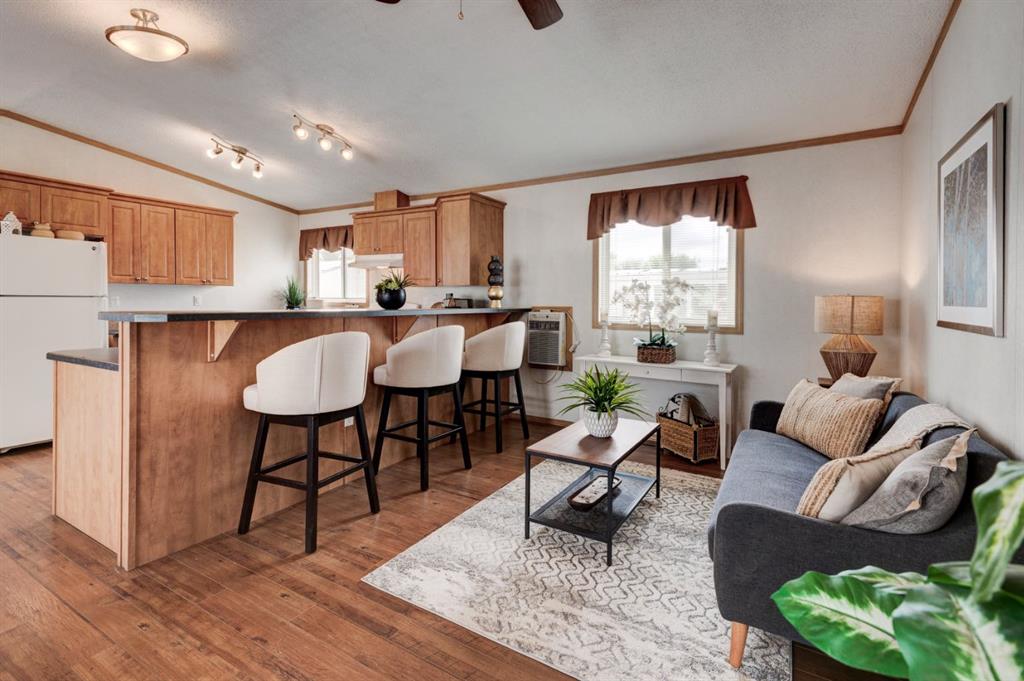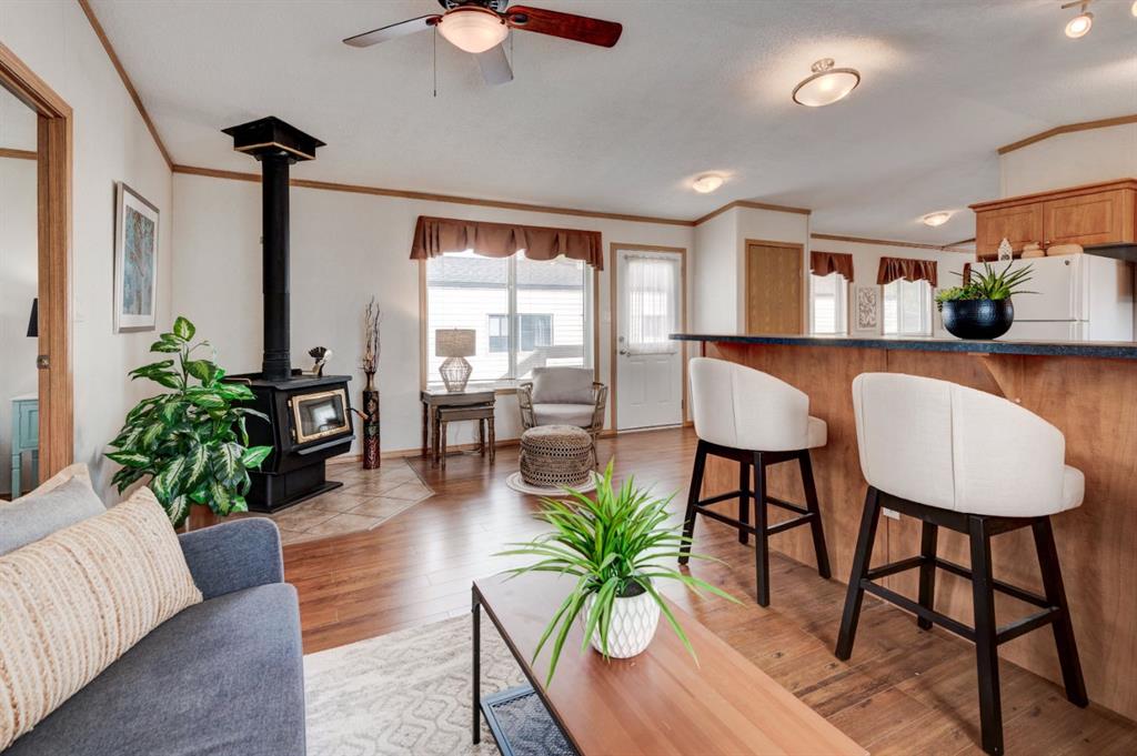 Enter into this immaculate and charming Custom Built 2013 manufactured home, 1120 sf home located in the plus-18 section of Mountview. Prepare to be impressed with everything this home has to offer. It is spacious with vaulted ceilings, bright and airy with the many windows in the living area, and the entire home, and open concept living. Click on the interactive iGuide for a virtual tour and "virtual walk through". This large kitchen has beautiful wood cabinets, loads of counter space to explore your culinary side, prep for your cooking and baking adventures plus plenty of room to move around. Newly installed dishwasher, newer gas stove, newer fridge. There is a large counter peninsula island that provides even more space for eating or entertaining. Adjacent to the kitchen is a spacious dining area that is drenched in light. The living room has ample space for your furniture and the open den area provides a wood burning woodstove (WETT inspection done) to keep you warm and cozy. This is a 2013 model, 20x56, with two bedrooms, two bathrooms, and has everything you could need. The primary bedroom at the front of the home has a huge ensuite with soaker tub, separate shower, and good size vanity. This bedroom can easily accommodate a king bed. The second bedroom is at the opposite end, along with a 4-piece bath, large separate laundry room with a new on-demand hot water system and back entry hall. This home has a new composite vinyl fence, new skirting, new front deck, new eavestrough and downspouts, new sewer pipes, and a newly installed electrical hookup and meter, with a City of Calgary permit. Don’t wait to view this property - you won’t be disappointed! Lease approval is required. Pets are allowed with approval. Lease rate of $1100 per month includes water, sewer, garbage pick up and snow removal. Sunpark Mountview is across from Elliston Park, minutes to East Hills Shopping Centre, Stoney Trail, International Avenue, and all levels of transit, shopping, restaurants and amenities.