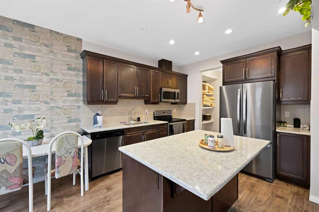 The main floor features 9-ft knockdown ceilings and a bright open-concept layout with a home office, 2-pc bath, spacious kitchen with maple cabinetry, dining area, and a sun-filled living room—perfect for family living and entertaining. Elegant stair railings lead to the upper level where you’ll find a large primary bedroom with a 4-pc ensuite, two additional generously sized bedrooms, a full common bathroom, bonus area with balcony access, and convenient upper-level laundry.