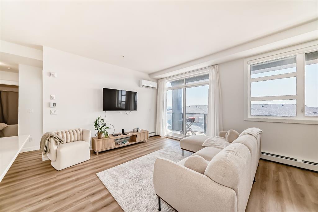 The spacious living room leads directly to the west facing balcony where you can relax and enjoy beautiful Calgary sunsets.